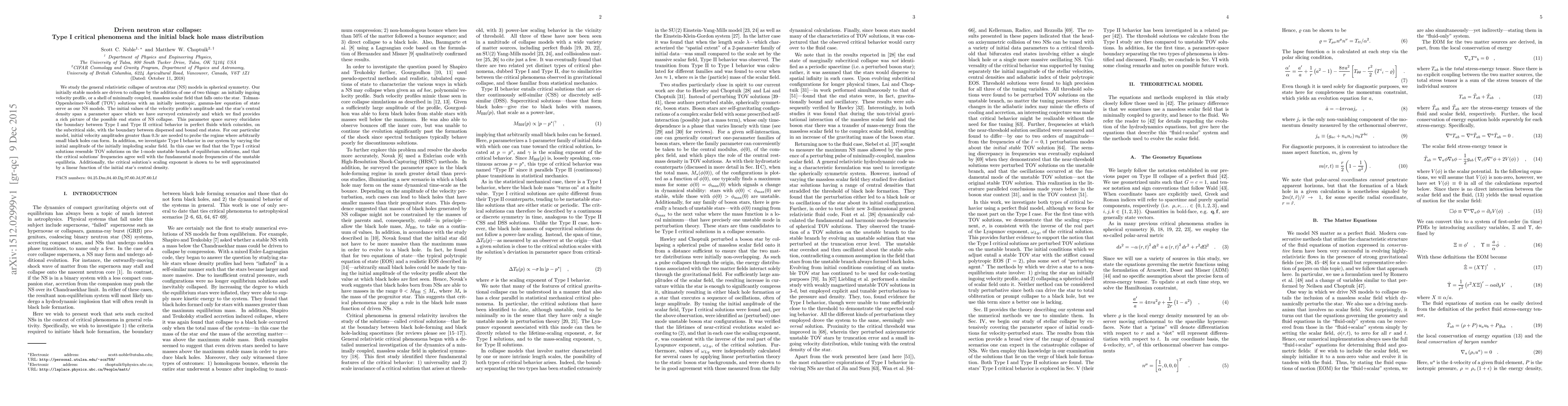 We study the general relativistic collapse of neutron star (NS) models in spherical symmetry. Our initially stable models are driven to collapse by the addition of one of two things: an initially in-going velocity profile, or a shell of minimally coupled, massless scalar field that falls onto the star. Tolman-Oppenheimer-Volkoff (TOV) solutions with an initially isentropic, gamma-law equation of state serve as our NS models. The initial values of the velocity profile's amplitude and the star's central density span a parameter space which we have surveyed extensively and which we find provides a rich picture of the possible end states of NS collapse. This parameter space survey elucidates the boundary between Type I and Type II critical behavior in perfect fluids which coincides, on the subcritical side, with the boundary between dispersed and bound end states. For our particular model, initial velocity amplitudes greater than 0.3c are needed to probe the regime where arbitrarily small black holes can form. In addition, we investigate Type I behavior in our system by varying the initial amplitude of the initially imploding scalar field. In this case we find that the Type I critical solutions resemble TOV solutions on the 1-mode unstable branch of equilibrium solutions, and that the critical solutions' frequencies agree well with the fundamental mode frequencies of the unstable equilibria. Additionally, the critical solution's scaling exponent is shown to be well approximated by a linear function of the initial star's central density.