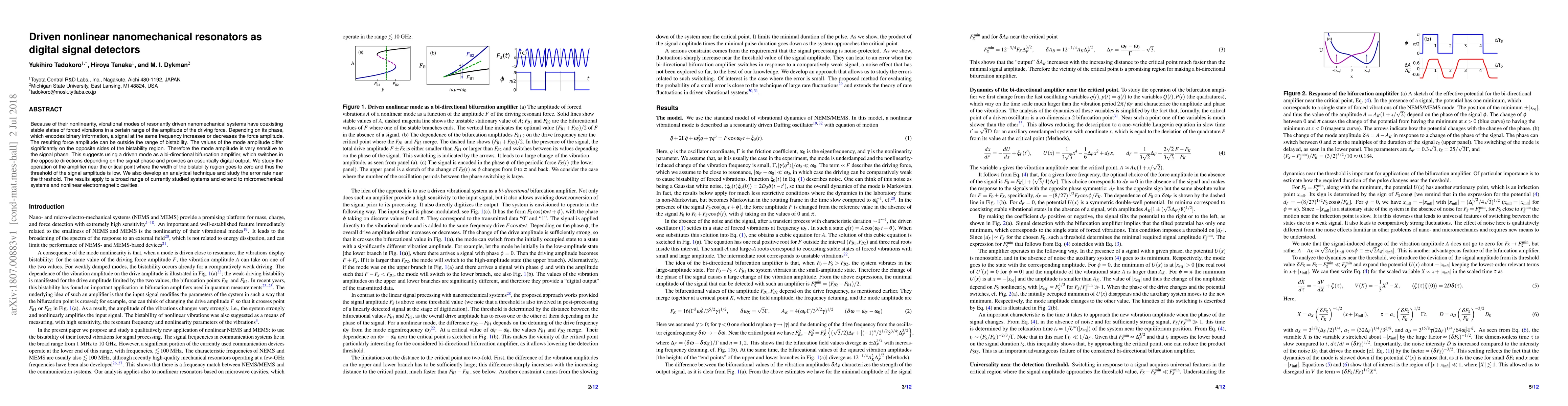 This paper explores driven nonlinear nanomechanical resonators that can detect digital signals by exploiting their bistability and phase-dependent amplitude modulation. The study focuses on their operation near the critical point of bistability, developing an analytical technique to analyze the error rate and demonstrating their potential as bi-directional bifurcation amplifiers.