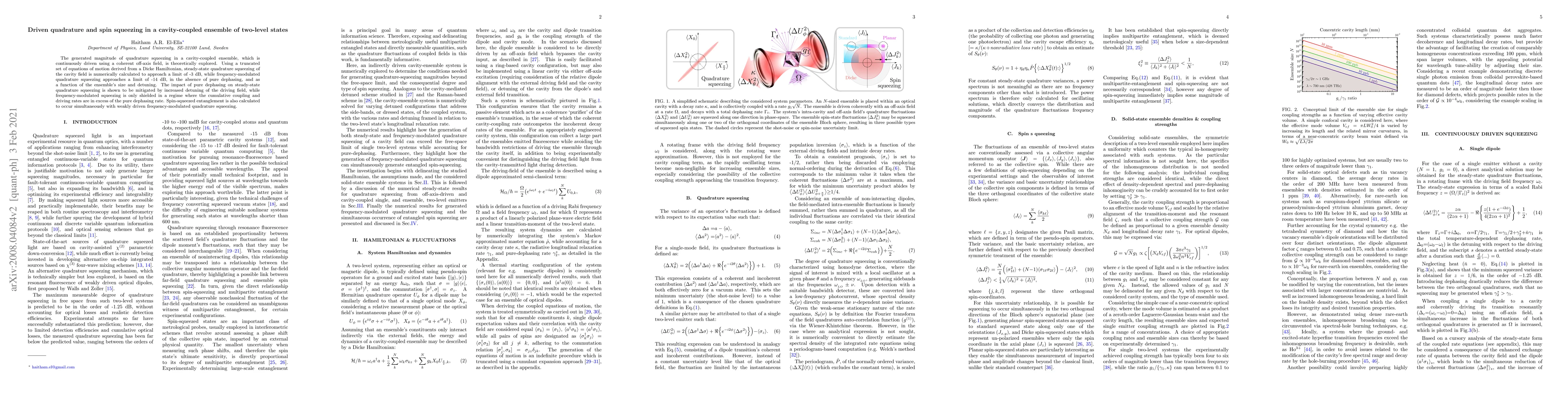 The generated magnitude of quadrature squeezing in a cavity-coupled ensemble, which is continuously driven using a coherent off-axis field, is theoretically explored. Using a truncated set of equations-of-motion derived from a Dicke Hamiltonian, steady-state quadrature squeezing of the cavity field is numerically calculated to approach a limit of -3 dB, while frequency-modulated quadrature squeezing approaches a limit of -14 dB, in the absence of pure-dephasing, and as a function of the ensemble's size and detuning. The impact of pure-dephasing on steady-state quadrature squeezing is shown to be mitigated by increased detuning of the driving field, while frequency-modulated squeezing is only shielded in a regime where the cumulative coupling and driving rates are in excess of the pure-dephasing rate. Spin-squeezed entanglement is also calculated to occur simultaneously with weakly-driven frequency-modulated quadrature squeezing.