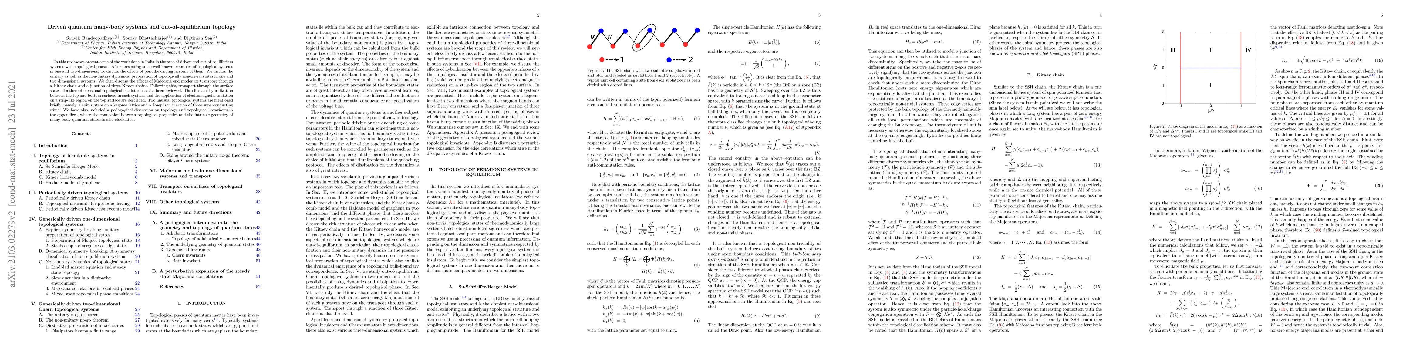 This review explores driven quantum many-body systems in India, focusing on out-of-equilibrium topological phases. It discusses the effects of periodic driving on topological states and Majorana modes in Kitaev chains, alongside transport in topological insulators and unusual systems like kagome lattice spin systems.