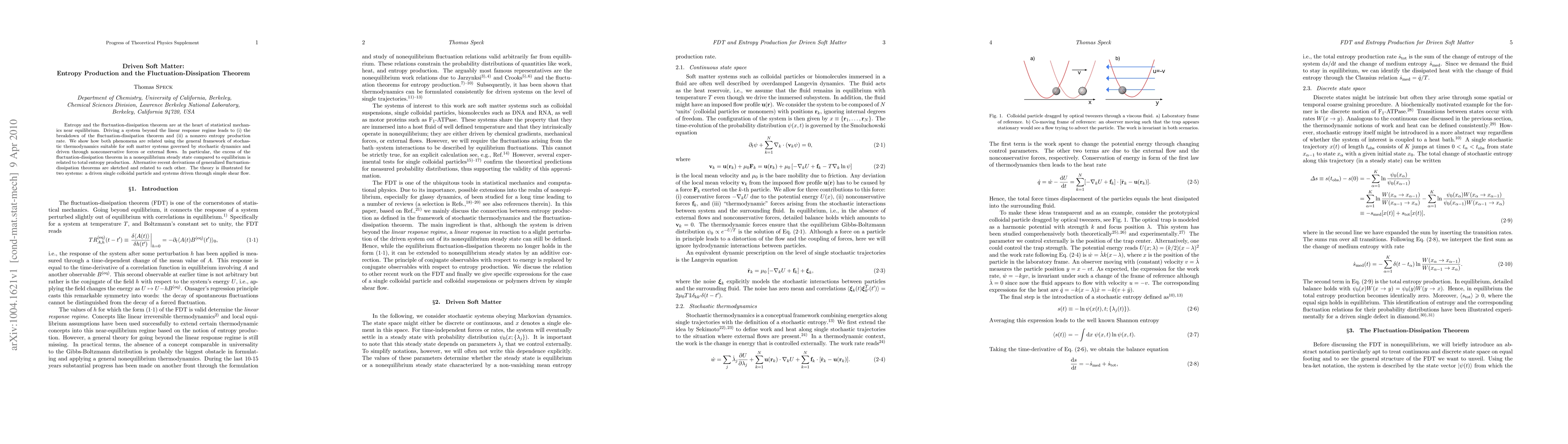 This paper explores entropy production and the fluctuation-dissipation theorem in driven soft matter systems, showing their breakdown beyond linear response and linking them to nonequilibrium steady states. The study uses stochastic thermodynamics to illustrate these phenomena in colloidal particles and shear-flow systems.