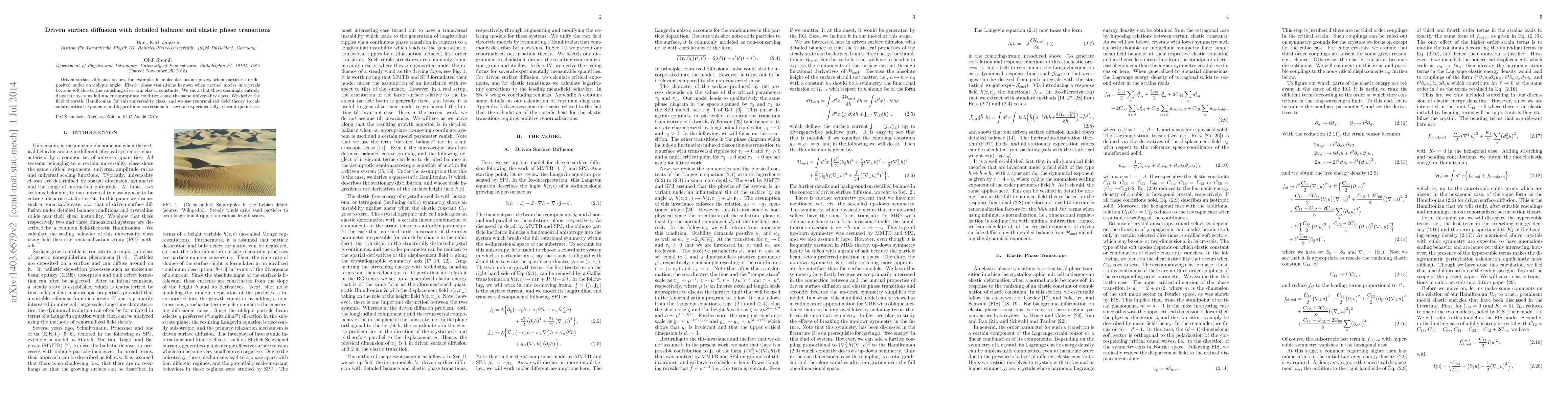 Driven surface diffusion occurs, for example, in molecular beam epitaxy when particles are deposited under an oblique angle. Elastic phase transitions happen when normal modes in crystals become soft due to the vanishing of certain elastic constants. We show that these seemingly entirely disparate systems fall under appropriate conditions into the same universality class. We derive the field theoretic Hamiltonian for this universality class, and we use renormalized field theory to calculate critical exponents and logarithmic corrections for several experimentally relevant quantities.