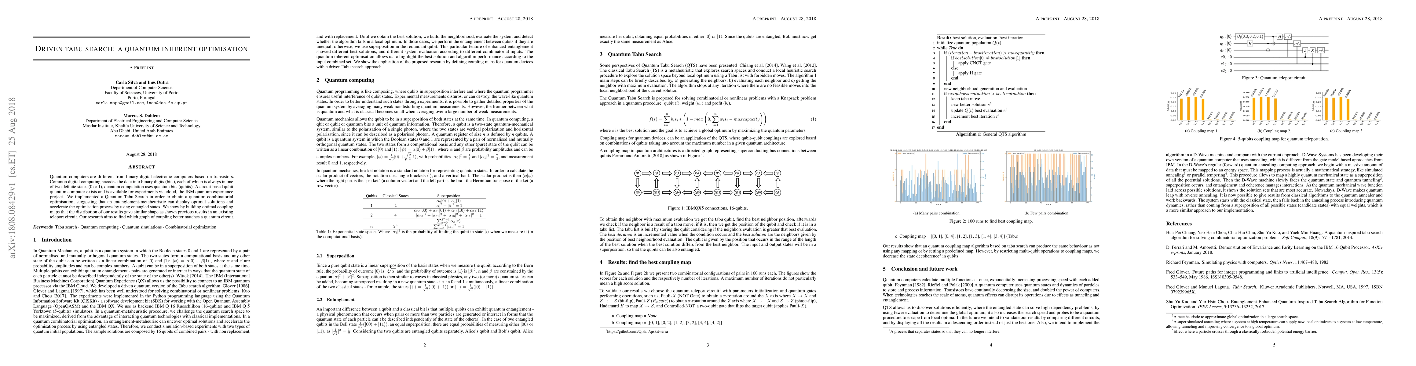 Quantum computers are different from binary digital electronic computers based on transistors. Common digital computing encodes the data into binary digits (bits), each of which is always in one of two definite states (0 or 1), quantum computation uses quantum bits (qubits). A circuit-based qubit quantum computer exists and is available for experiments via cloud, the IBM quantum experience project. We implemented a Quantum Tabu Search in order to obtain a quantum combinatorial optimisation, suggesting that an entanglement-metaheuristic can display optimal solutions and accelerate the optimisation process by using entangled states. We show by building optimal coupling maps that the distribution of our results gave similar shape as shown previous results in an existing teleport circuit. Our research aims to find which graph of coupling better matches a quantum circuit.