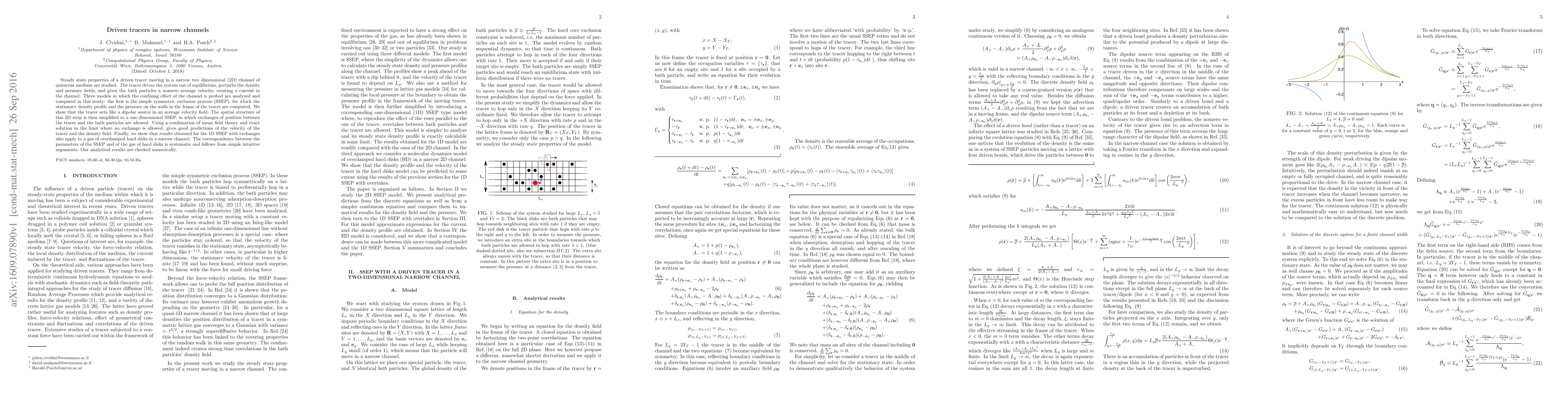 Steady state properties of a driven tracer moving in a narrow two dimensional (2D) channel of quiescent medium are studied. The tracer drives the system out of equilibrium, perturbs the density and pressure fields, and gives the bath particles a nonzero average velocity, creating a current in the channel. Three models in which the confining effect of the channel is probed are analyzed and compared in this study: the first is the simple symmetric exclusion process (SSEP), for which the stationary density profile and the pressure on the walls in the frame of the tracer are computed. We show that the tracer acts like a dipolar source in an average velocity field. The spatial structure of this 2D strip is then simplified to a one dimensional SSEP, in which exchanges of position between the tracer and the bath particles are allowed. Using a combination of mean field theory and exact solution in the limit where no exchange is allowed, gives good predictions of the velocity of the tracer and the density field. Finally, we show that results obtained for the 1D SSEP with exchanges also apply to a gas of overdamped hard disks in a narrow channel. The correspondence between the parameters of the SSEP and of the gas of hard disks is systematic and follows from simple intuitive arguments. Our analytical results are checked numerically.