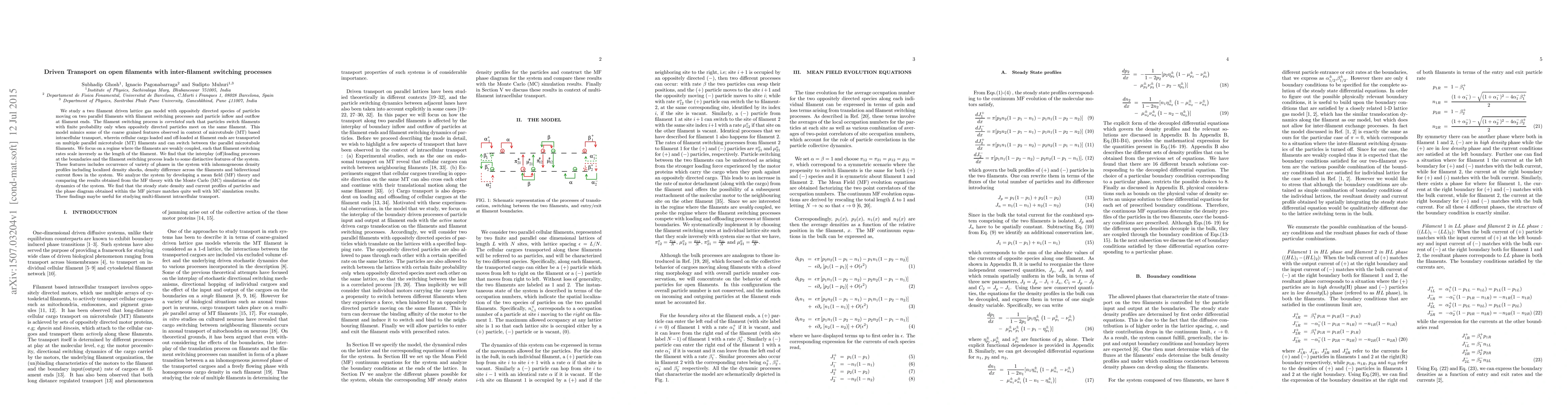 The research employs a two filament driven lattice gas model with oppositely directed species of particles moving on two parallel filaments, incorporating filament switching processes and particle inflow/outflow at filament ends. The filament switching is correlated, allowing particle swaps only when oppositely directed particles meet on the same filament, mimicking microtubule-based intracellular transport.