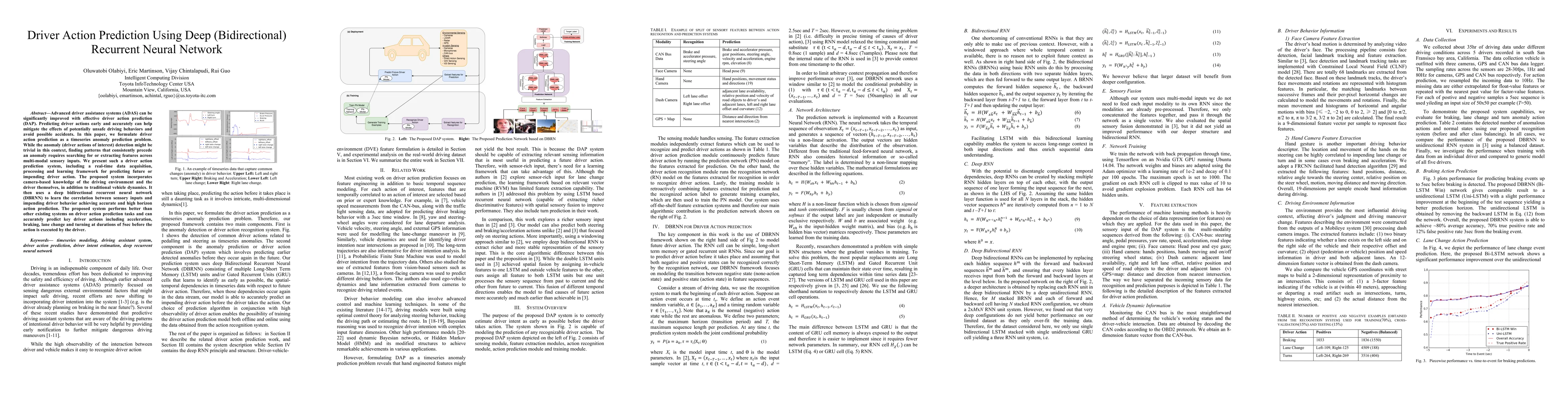 This paper proposes a deep bidirectional recurrent neural network (DBRNN) system for predicting driver actions up to 5 seconds in advance, utilizing multi-modal sensory inputs and vehicle dynamics to improve advanced driver assistance systems. The model achieves superior performance in predicting actions like acceleration, braking, lane change, and turning compared to existing systems.
