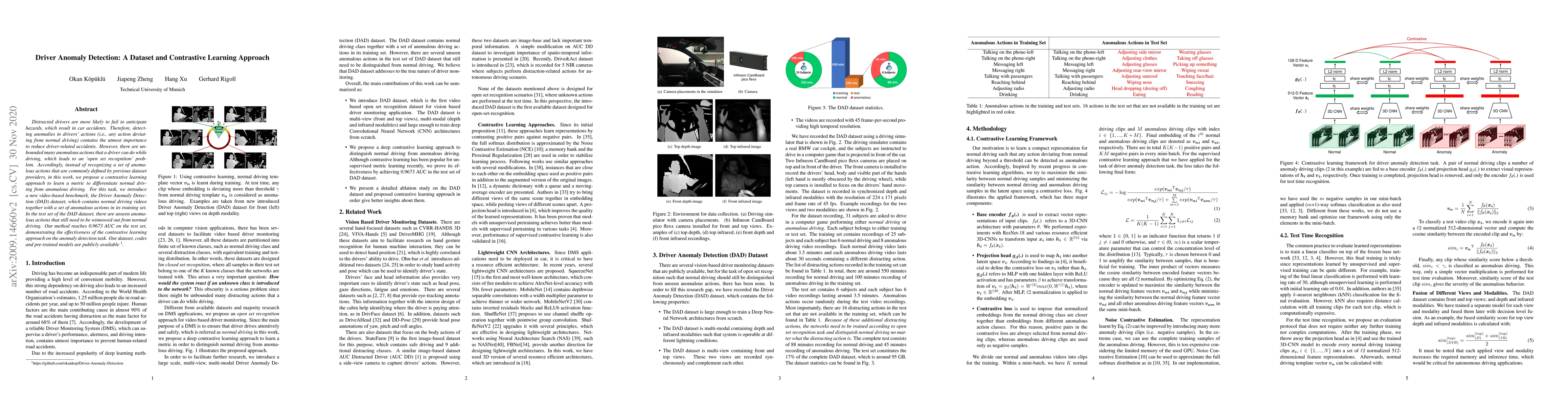 This paper proposes a contrastive learning approach for detecting anomalies in drivers' actions using a new video-based dataset, the Driver Anomaly Detection (DAD) dataset, which includes both normal and anomalous driving videos. The method achieves an AUC of 0.9673 on the test set, showcasing the effectiveness of the approach in identifying unseen anomalous actions.