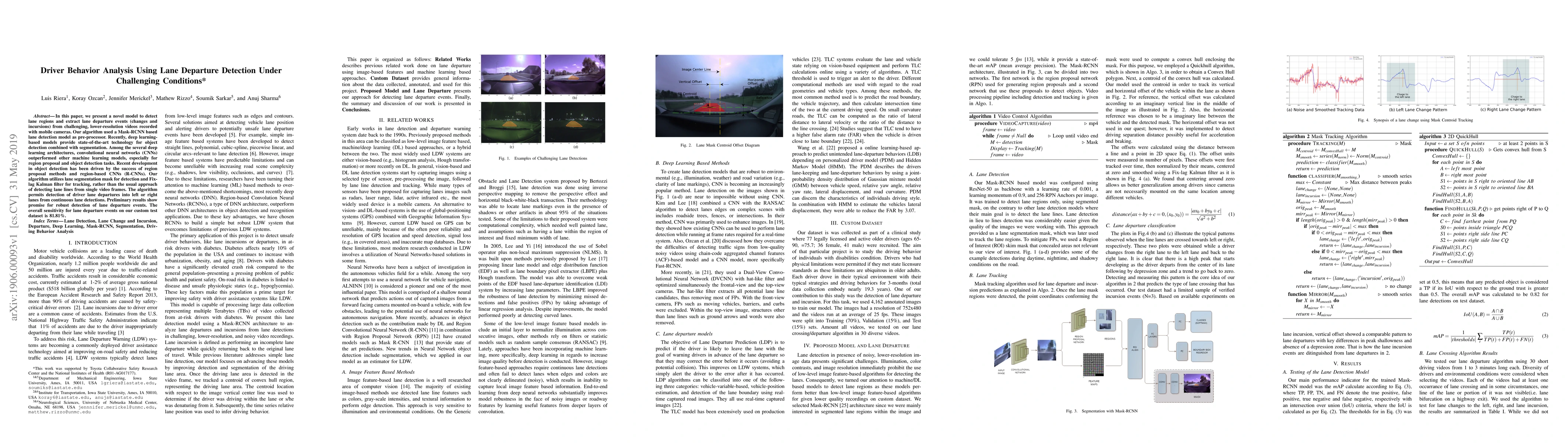 This paper introduces a novel deep learning-based model using Mask-RCNN for lane detection and Fix-lag Kalman filter for tracking to identify lane departure events in lower-resolution videos. The model shows a sensitivity of 81.81% for detecting lane departures in challenging conditions.