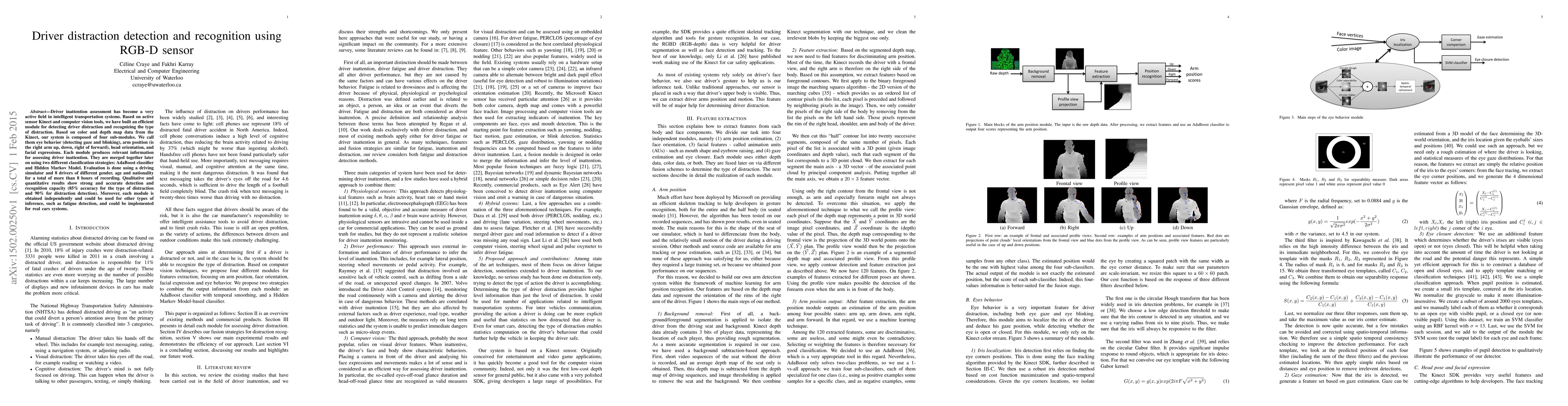 This paper presents a driver distraction detection system using a Kinect sensor and computer vision techniques, comprising modules for eye behavior, arm position, head orientation, and facial expressions. The system employs AdaBoost and Hidden Markov Model for classification, achieving 85% accuracy in distraction type recognition and 90% in distraction detection, validated through extensive simulator-based testing.