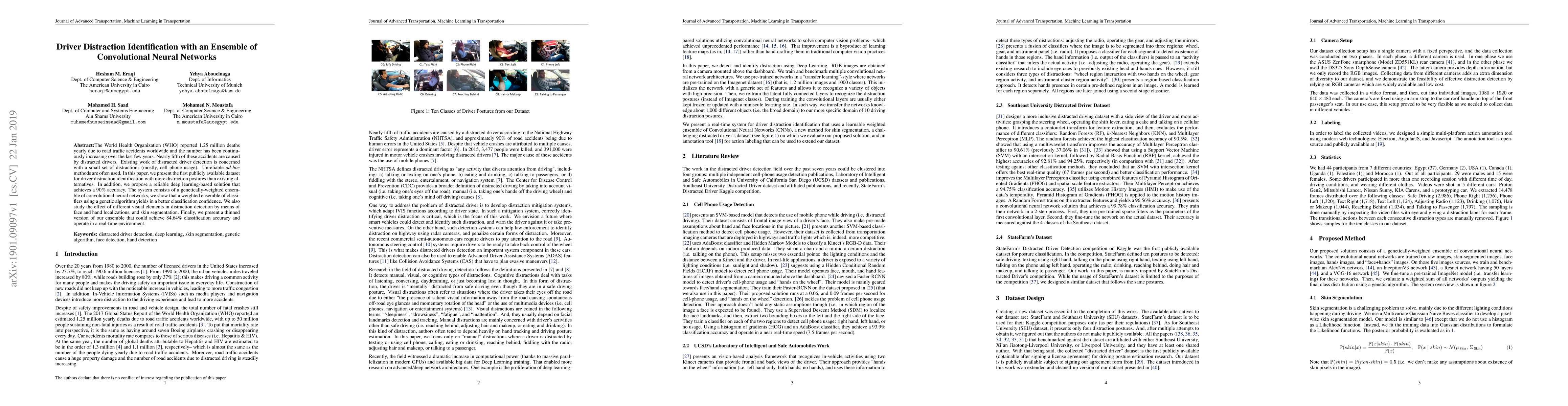 The World Health Organization (WHO) reported 1.25 million deaths yearly due to road traffic accidents worldwide and the number has been continuously increasing over the last few years. Nearly fifth of these accidents are caused by distracted drivers. Existing work of distracted driver detection is concerned with a small set of distractions (mostly, cell phone usage). Unreliable ad-hoc methods are often used.In this paper, we present the first publicly available dataset for driver distraction identification with more distraction postures than existing alternatives. In addition, we propose a reliable deep learning-based solution that achieves a 90% accuracy. The system consists of a genetically-weighted ensemble of convolutional neural networks, we show that a weighted ensemble of classifiers using a genetic algorithm yields in a better classification confidence. We also study the effect of different visual elements in distraction detection by means of face and hand localizations, and skin segmentation. Finally, we present a thinned version of our ensemble that could achieve 84.64% classification accuracy and operate in a real-time environment.