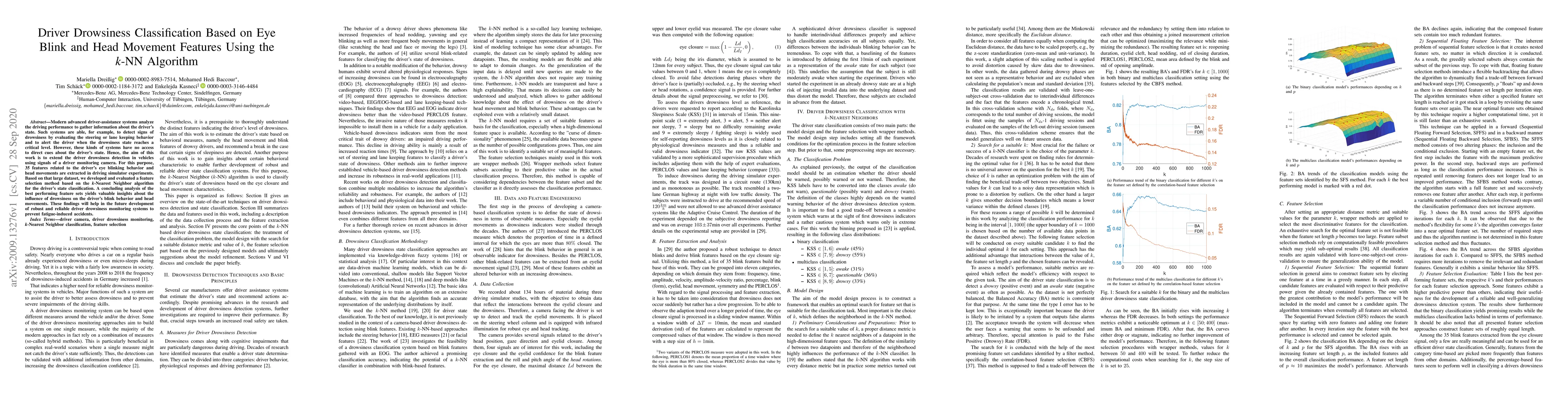 This paper develops a k-NN algorithm for classifying driver drowsiness using features from eye blink and head movement data collected in driving simulators. The study identifies the most effective features for drowsiness detection, providing insights to improve future driver monitoring systems.