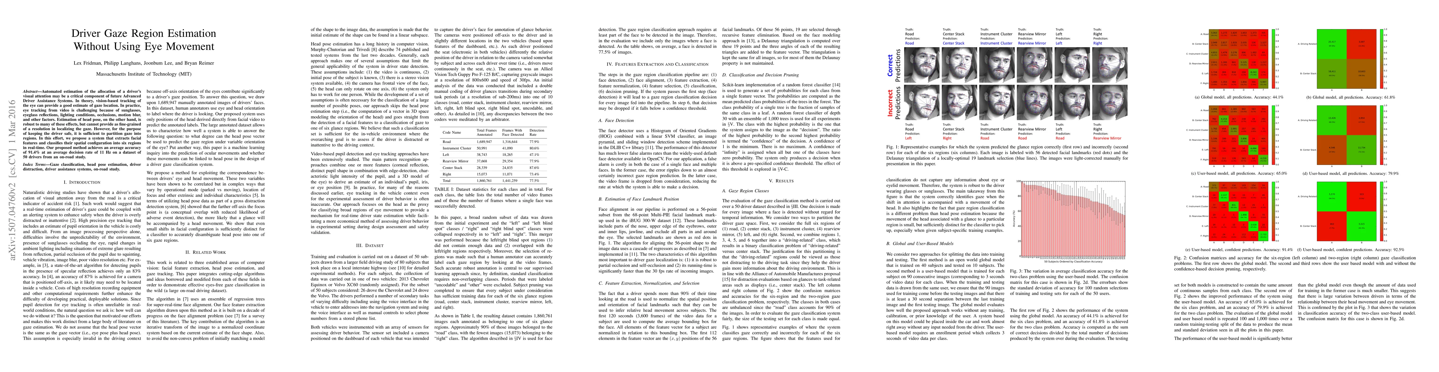 This paper proposes a method to estimate driver gaze regions without relying on eye movement tracking, addressing challenges like sunglasses and lighting. It uses facial feature extraction and spatial classification to partition gaze into six regions, achieving 91.4% accuracy at 11 Hz on a dataset of 50 drivers.
