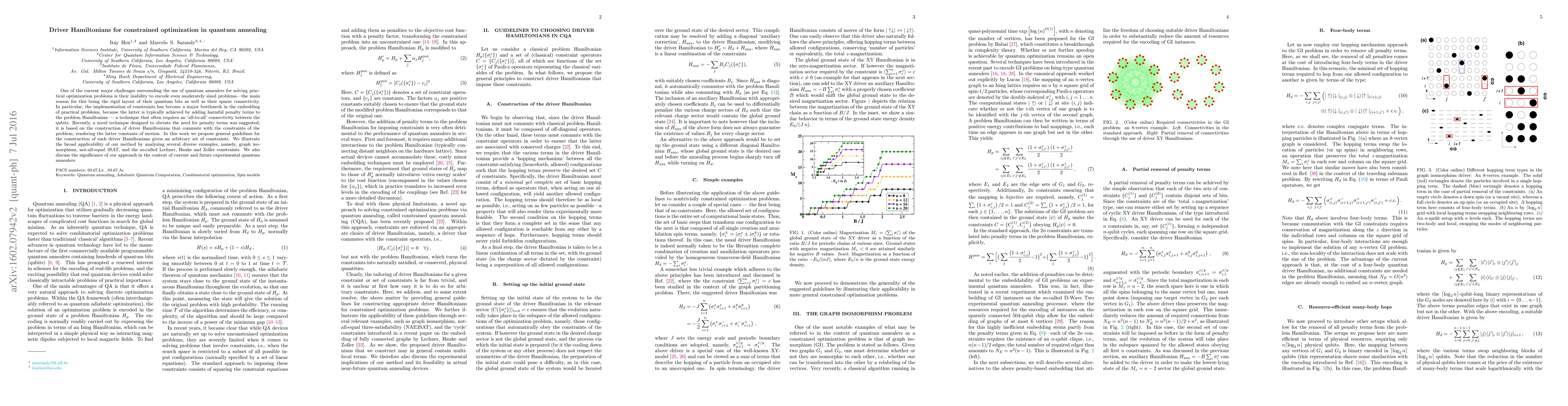 This paper proposes a novel technique using driver Hamiltonians to solve optimization problems in quantum annealing without the need for penalty terms, addressing the challenge of embedding constraints. The method ensures constraints are constants of motion, demonstrated through examples like graph isomorphism and 3SAT, and discusses its relevance for current quantum annealers.