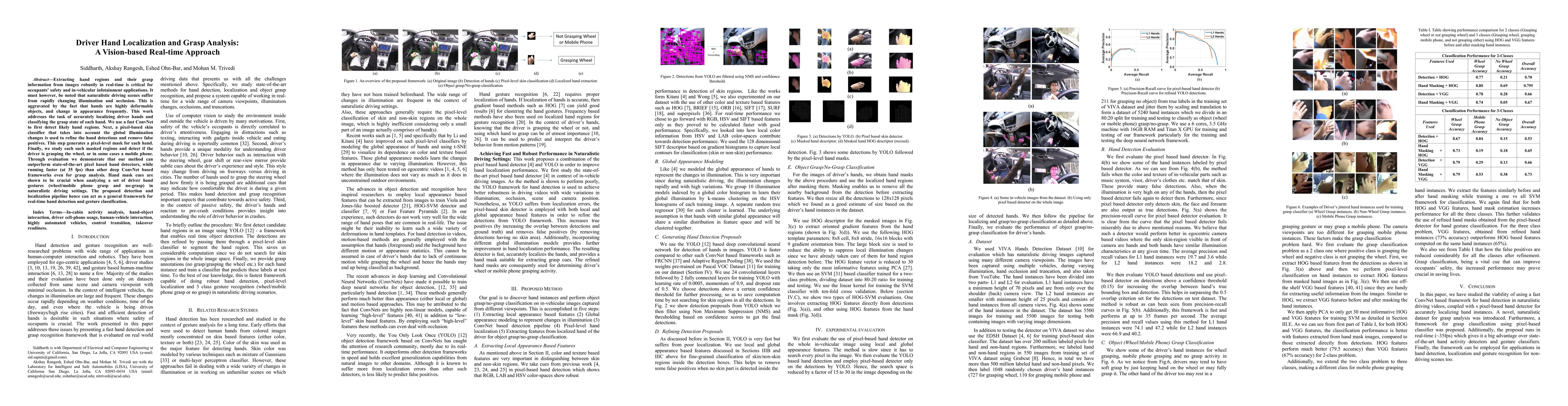This paper presents a vision-based real-time approach for driver hand localization and grasp analysis using a fast ConvNet and a pixel-based skin classifier. The method outperforms existing detectors and achieves 35 fps, making it suitable for in-vehicle safety and infotainment applications.