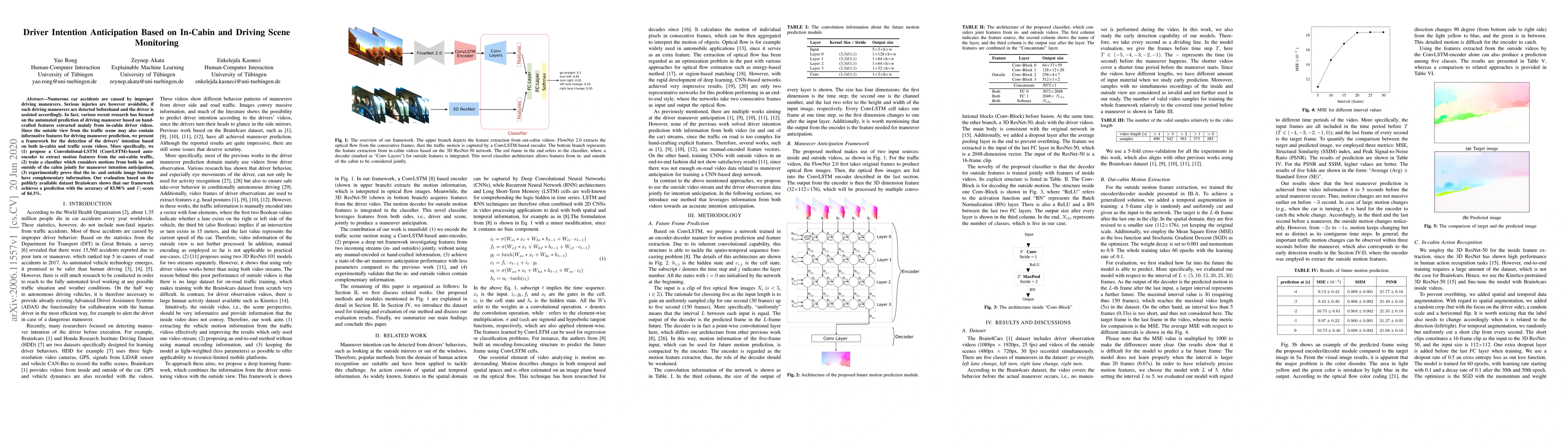 This paper proposes a framework to anticipate driver intentions using both in-cabin and traffic scene videos, employing a ConvLSTM-based auto-encoder for feature extraction and a classifier for maneuver prediction. Experimental results show the complementary nature of the in- and outside features, achieving an 83.98% accuracy and an 84.3% F1-score.