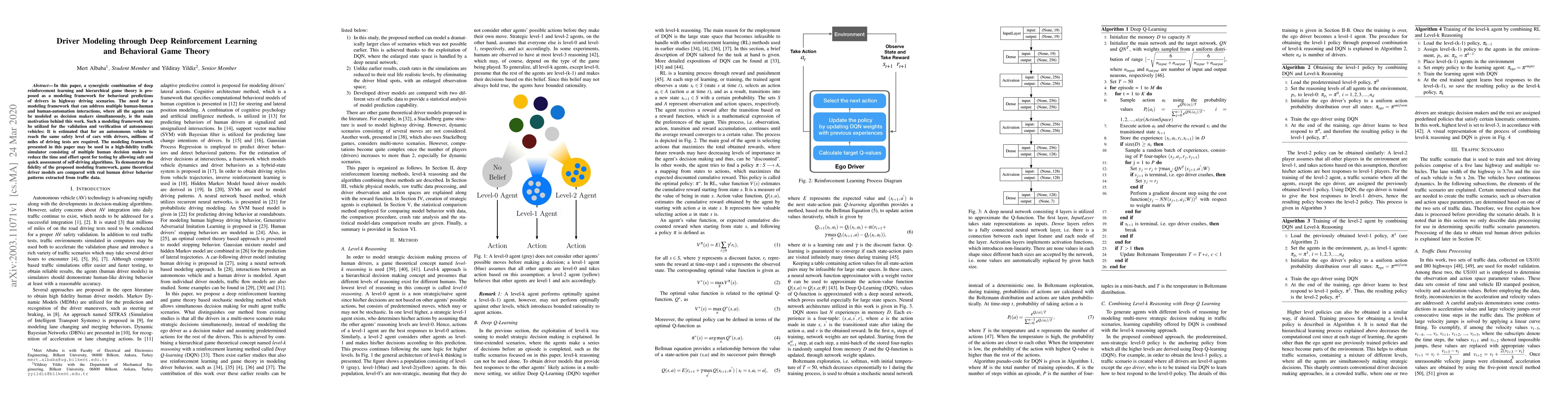 This paper proposes a deep reinforcement learning and hierarchical game theory framework to model driver behavior in highway scenarios, aiming to simulate human-human and human-automation interactions efficiently. The framework is intended to reduce the extensive testing required for autonomous vehicle validation, by providing a high-fidelity traffic simulator that mimics real driver behavior.
