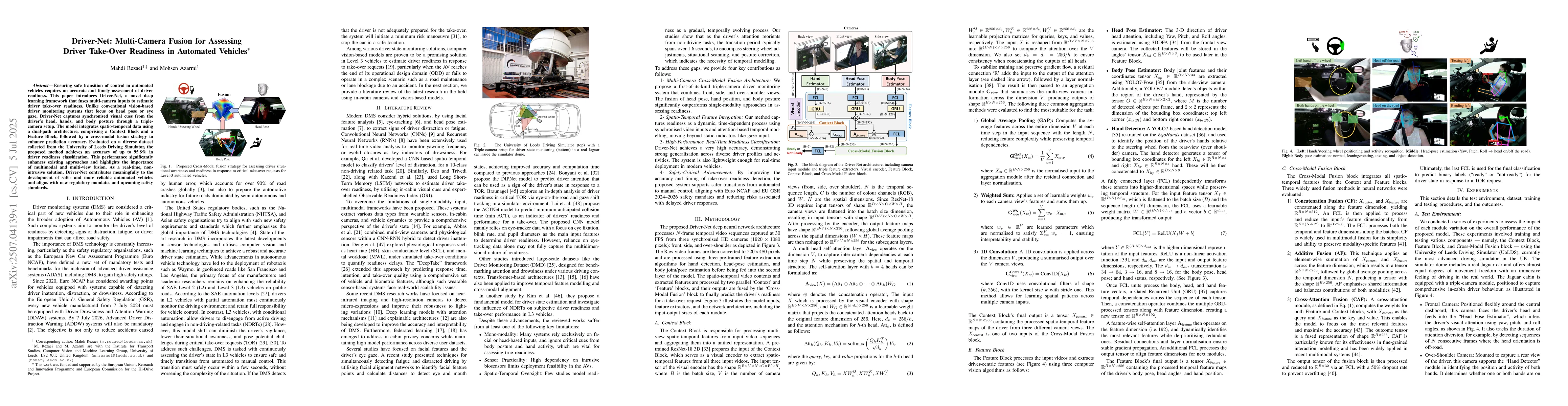 Ensuring safe transition of control in automated vehicles requires an accurate and timely assessment of driver readiness. This paper introduces Driver-Net, a novel deep learning framework that fuses multi-camera inputs to estimate driver take-over readiness. Unlike conventional vision-based driver monitoring systems that focus on head pose or eye gaze, Driver-Net captures synchronised visual cues from the driver's head, hands, and body posture through a triple-camera setup. The model integrates spatio-temporal data using a dual-path architecture, comprising a Context Block and a Feature Block, followed by a cross-modal fusion strategy to enhance prediction accuracy. Evaluated on a diverse dataset collected from the University of Leeds Driving Simulator, the proposed method achieves an accuracy of up to 95.8% in driver readiness classification. This performance significantly enhances existing approaches and highlights the importance of multimodal and multi-view fusion. As a real-time, non-intrusive solution, Driver-Net contributes meaningfully to the development of safer and more reliable automated vehicles and aligns with new regulatory mandates and upcoming safety standards.