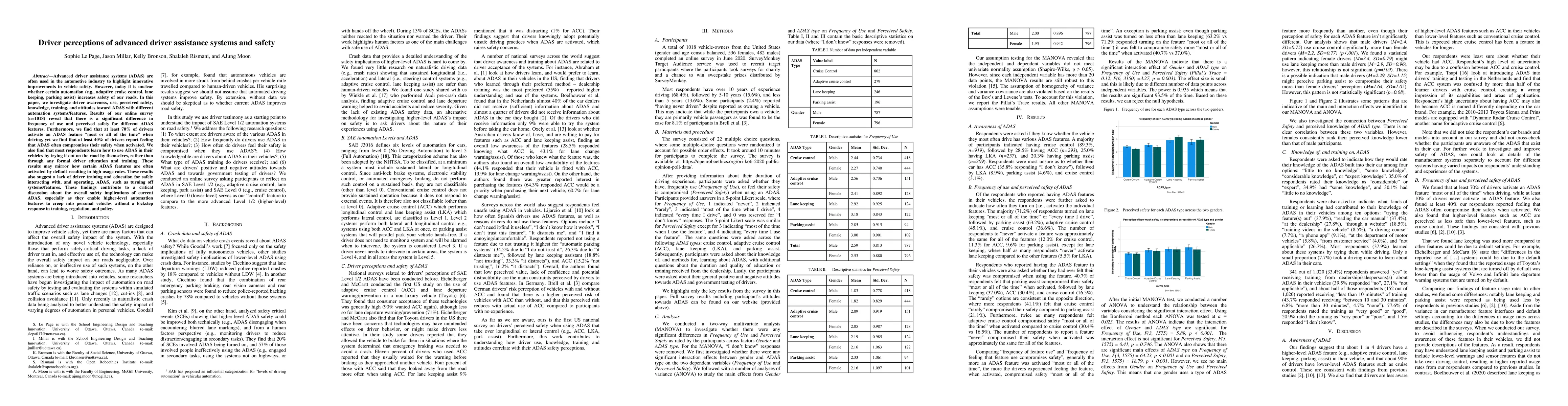 This paper investigates driver perceptions of advanced driver assistance systems (ADAS), finding significant differences in usage and perceived safety across various features. Despite high usage rates, nearly 40% of drivers feel that ADAS compromises their safety, highlighting a lack of formal driver training and education, which raises concerns about the overall safety implications of ADAS.