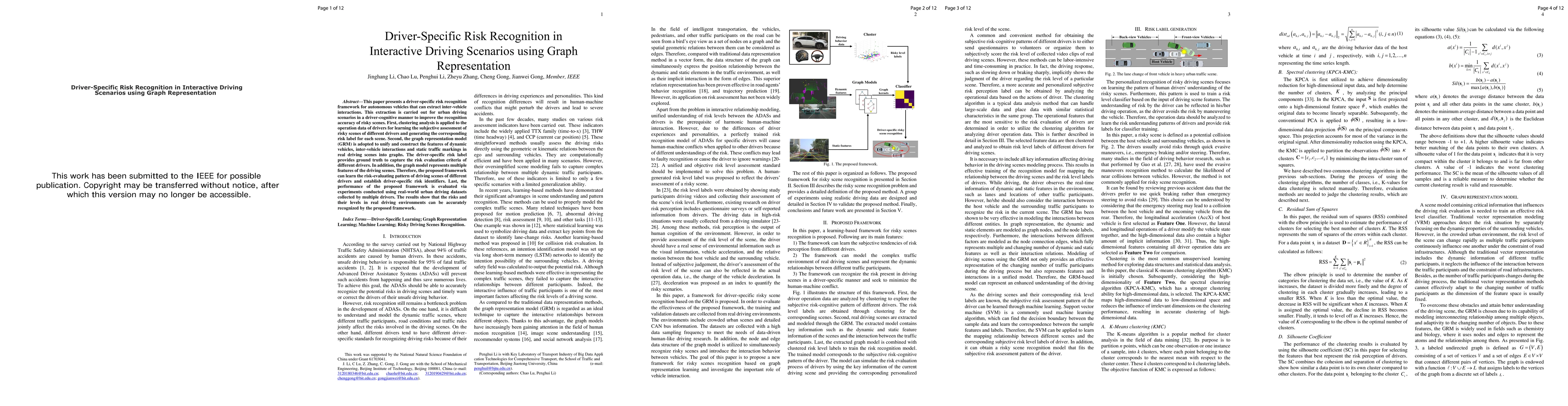 This paper proposes a driver-specific risk recognition framework for autonomous vehicles using graph representation to improve risk scene recognition in urban driving scenarios. It employs clustering analysis and graph models to learn and identify individual drivers' risk assessment patterns and evaluate real-world driving risks accurately.