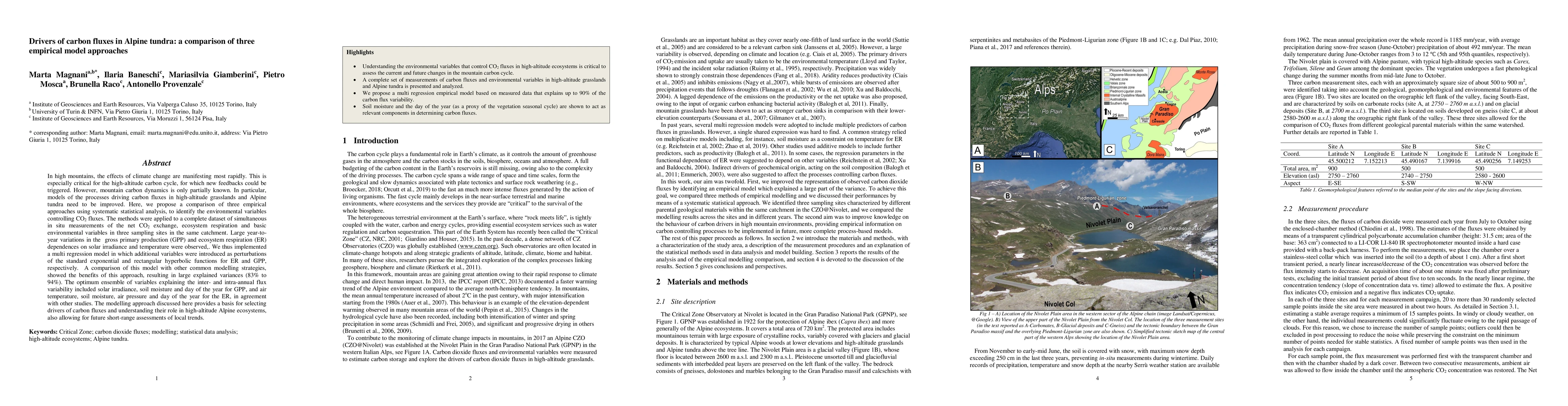 A study compared three empirical approaches to model carbon fluxes in Alpine tundra, finding that a multi-regression model with perturbations of standard functions explained 83-94% of the data, highlighting the role of solar irradiance, soil moisture, and temperature as key drivers.