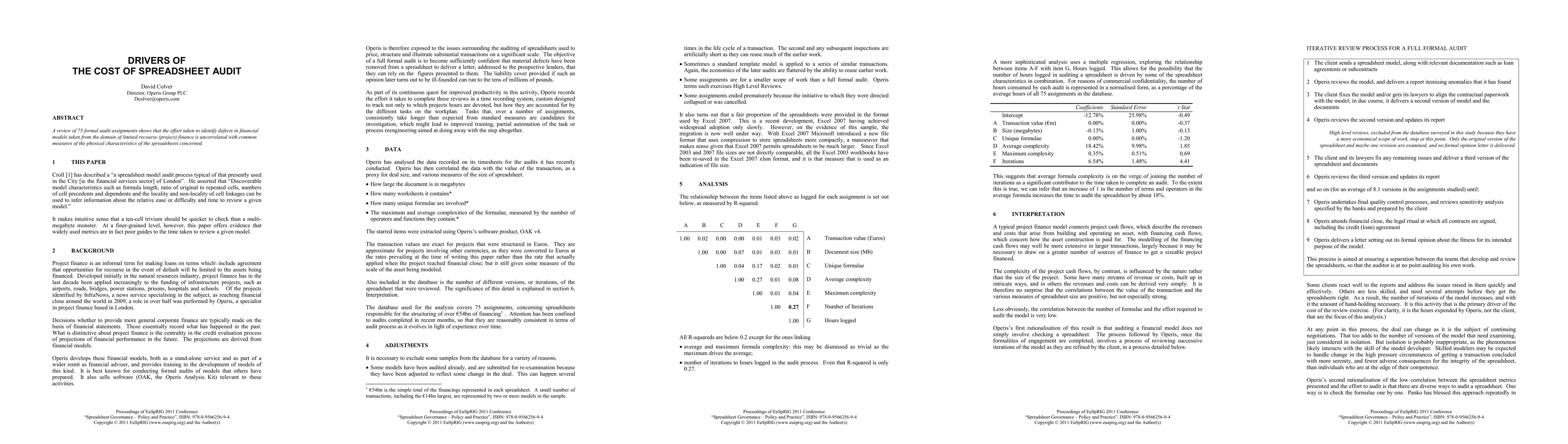 A review of 75 formal audit assignments shows that the effort taken to identify defects in financial models taken from the domain of limited recourse (project) finance is uncorrelated with common measures of the physical characteristics of the spreadsheets concerned.
