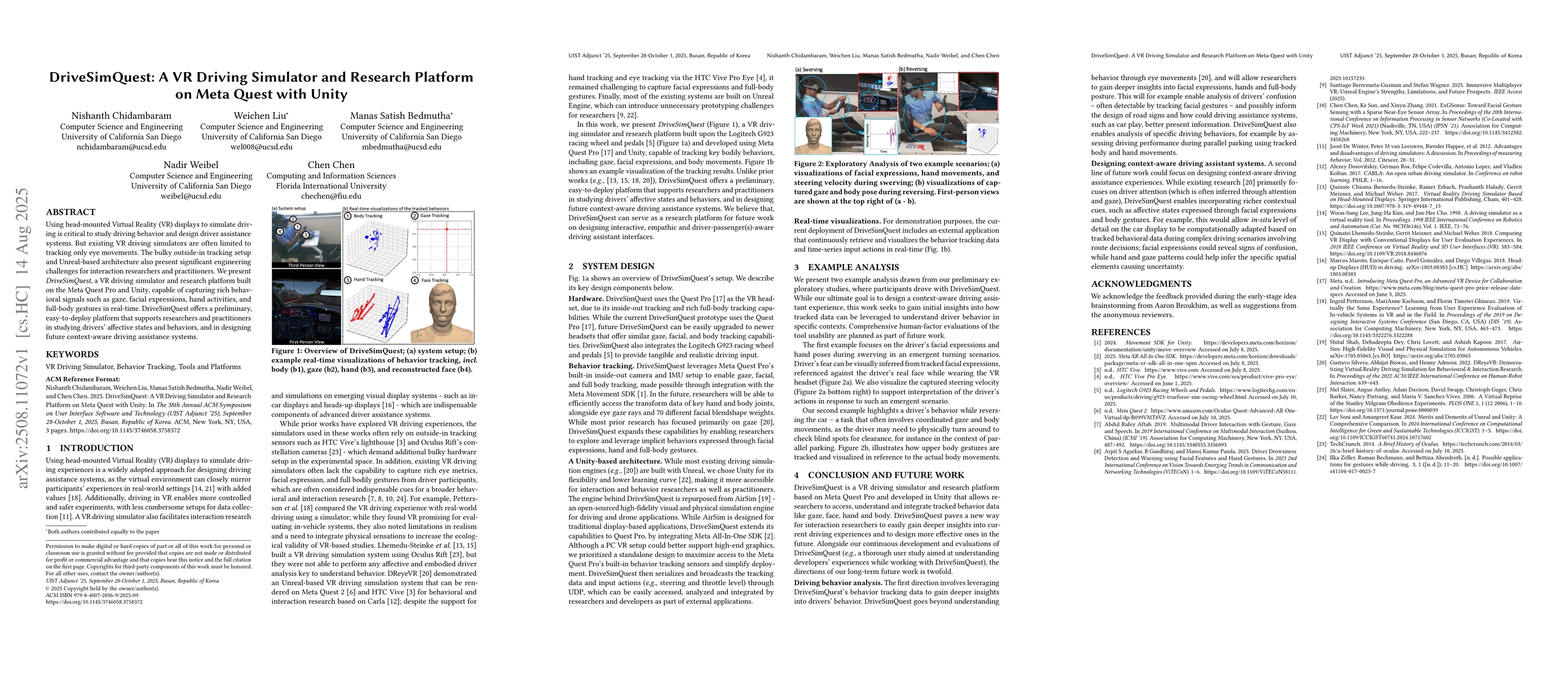 Using head-mounted Virtual Reality (VR) displays to simulate driving is critical to studying driving behavior and designing driver assistance systems. But existing VR driving simulators are often limited to tracking only eye movements. The bulky outside-in tracking setup and Unreal-based architecture also present significant engineering challenges for interaction researchers and practitioners. We present DriveSimQuest, a VR driving simulator and research platform built on the Meta Quest Pro and Unity, capable of capturing rich behavioral signals such as gaze, facial expressions, hand activities, and full-body gestures in real-time. DriveSimQuest offers a preliminary, easy-to-deploy platform that supports researchers and practitioners in studying drivers' affective states and behaviors, and in designing future context-aware driving assistance systems.
