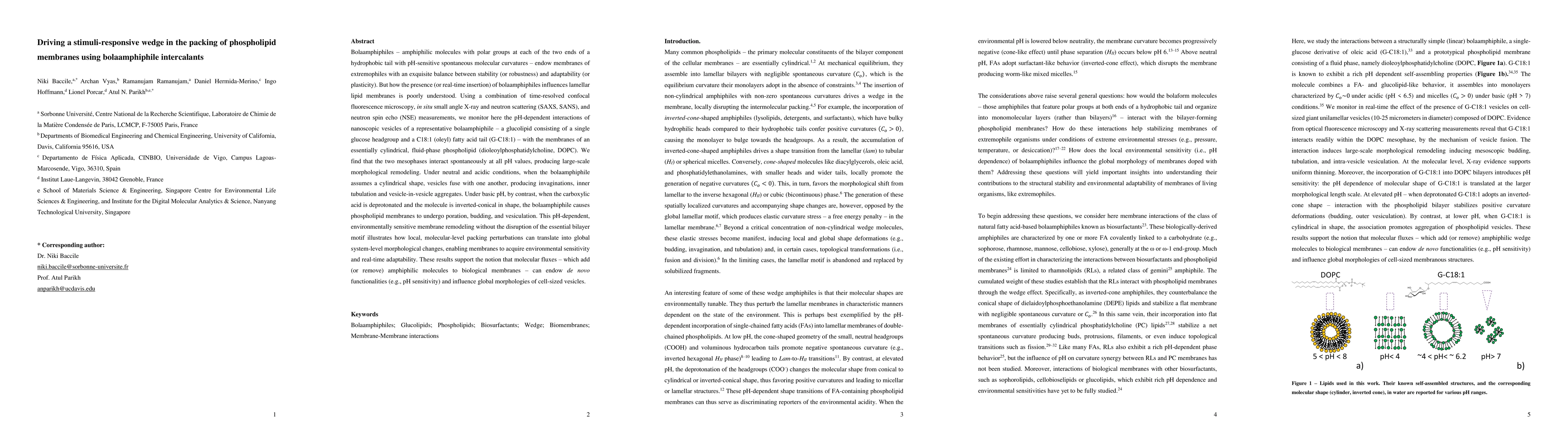 Bolaamphiphilesamphiphilic molecules with polar groups at each of the two ends of a hydrophobic tail with pH-sensitive spontaneous molecular curvaturesendow membranes of extremophiles with an exquisite balance between stability (or robustness) and adaptability (or plasticity). But how the presence (or real-time insertion) of bolaamphiphiles influences lamellar lipid membranes is poorly understood. Using a combination of time-resolved confocal fluorescence microscopy, in situ small angle X-ray and neutron scattering (SAXS, SANS), and neutron spin echo (NSE) measurements, we monitor here the pH-dependent interactions of nanoscopic vesicles of a representative bolaamphiphilea glucolipid consisting of a single glucose headgroup and a C18:1 (oleyl) fatty acid tail (G-C18:1)with the membranes of an essentially cylindrical, fluid-phase phospholipid (dioleoylphosphatidylcholine, DOPC). We find that the two mesophases interact spontaneously at all pH values, producing large-scale morphological remodeling. Under neutral and acidic conditions, when the bolaamphiphile assumes a cylindrical shape, vesicles fuse with one another, producing invaginations, inner tubulation and vesicle-in-vesicle aggregates. Under basic pH, by contrast, when the carboxylic acid is deprotonated and the molecule is inverted-conical in shape, the bolaamphiphile causes phospholipid membranes to undergo poration, budding, and vesiculation. This pH-dependent, environmentally sensitive membrane remodeling without the disruption of the essential bilayer motif illustrates how local, molecular-level packing perturbations can translate into global system-level morphological changes, enabling membranes to acquire environmental sensitivity and real-time adaptability. These results support the notion that molecular fluxeswhich add (or remove) amphiphilic molecules to biological membranescan endow de novo functionalities (e.g., pH sensitivity) and influence global morphologies of cell-sized vesicles.