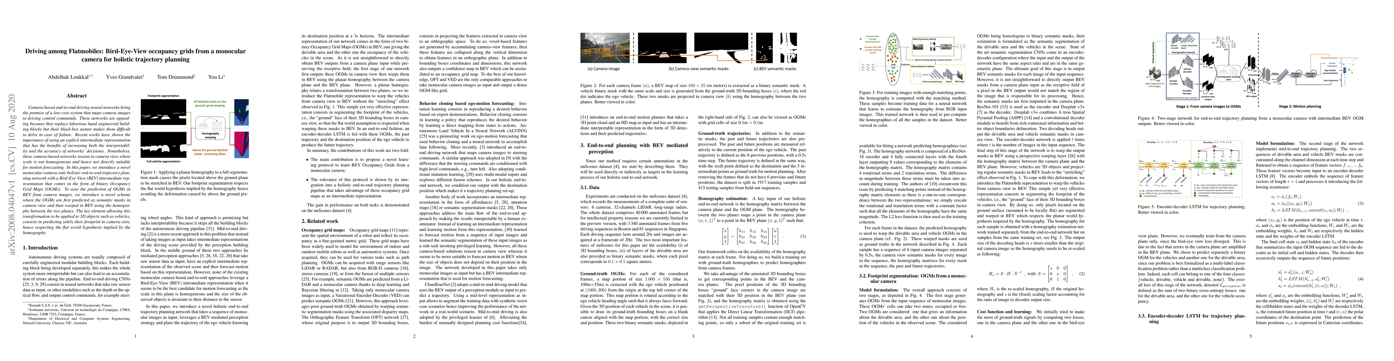 Camera-based end-to-end driving neural networks bring the promise of a low-cost system that maps camera images to driving control commands. These networks are appealing because they replace laborious hand engineered building blocks but their black-box nature makes them difficult to delve in case of failure. Recent works have shown the importance of using an explicit intermediate representation that has the benefits of increasing both the interpretability and the accuracy of networks' decisions. Nonetheless, these camera-based networks reason in camera view where scale is not homogeneous and hence not directly suitable for motion forecasting. In this paper, we introduce a novel monocular camera-only holistic end-to-end trajectory planning network with a Bird-Eye-View (BEV) intermediate representation that comes in the form of binary Occupancy Grid Maps (OGMs). To ease the prediction of OGMs in BEV from camera images, we introduce a novel scheme where the OGMs are first predicted as semantic masks in camera view and then warped in BEV using the homography between the two planes. The key element allowing this transformation to be applied to 3D objects such as vehicles, consists in predicting solely their footprint in camera-view, hence respecting the flat world hypothesis implied by the homography.