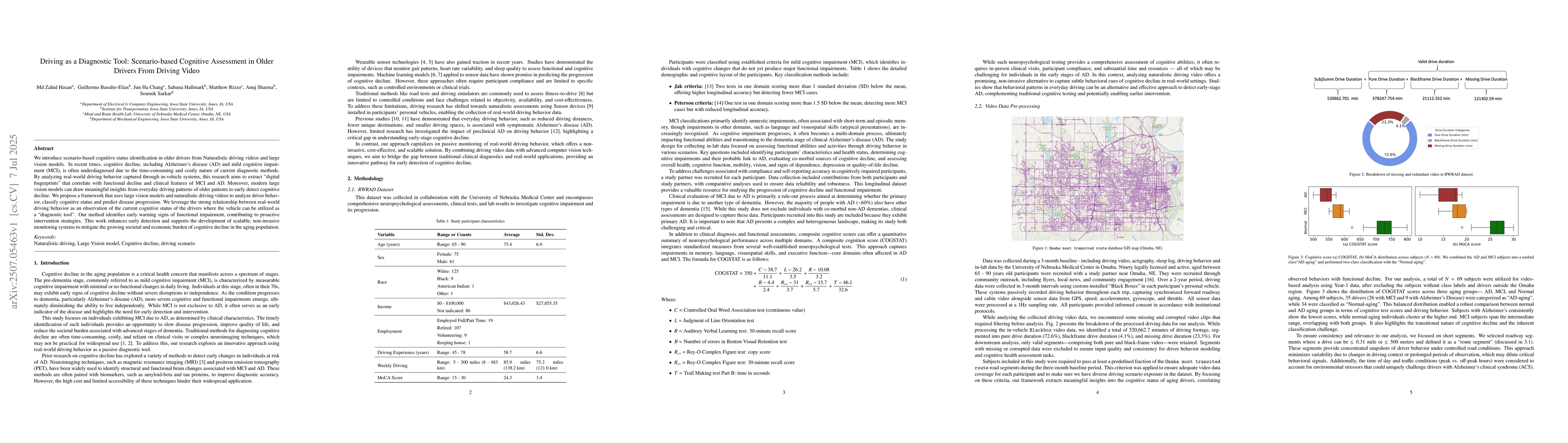 We introduce scenario-based cognitive status identification in older drivers from Naturalistic driving videos and large vision models. In recent times, cognitive decline, including Alzheimer's disease (AD) and mild cognitive impairment (MCI), is often underdiagnosed due to the time-consuming and costly nature of current diagnostic methods. By analyzing real-world driving behavior captured through in-vehicle systems, this research aims to extract "digital fingerprints" that correlate with functional decline and clinical features of MCI and AD. Moreover, modern large vision models can draw meaningful insights from everyday driving patterns of older patients to early detect cognitive decline. We propose a framework that uses large vision models and naturalistic driving videos to analyze driver behavior, classify cognitive status and predict disease progression. We leverage the strong relationship between real-world driving behavior as an observation of the current cognitive status of the drivers where the vehicle can be utilized as a "diagnostic tool". Our method identifies early warning signs of functional impairment, contributing to proactive intervention strategies. This work enhances early detection and supports the development of scalable, non-invasive monitoring systems to mitigate the growing societal and economic burden of cognitive decline in the aging population.