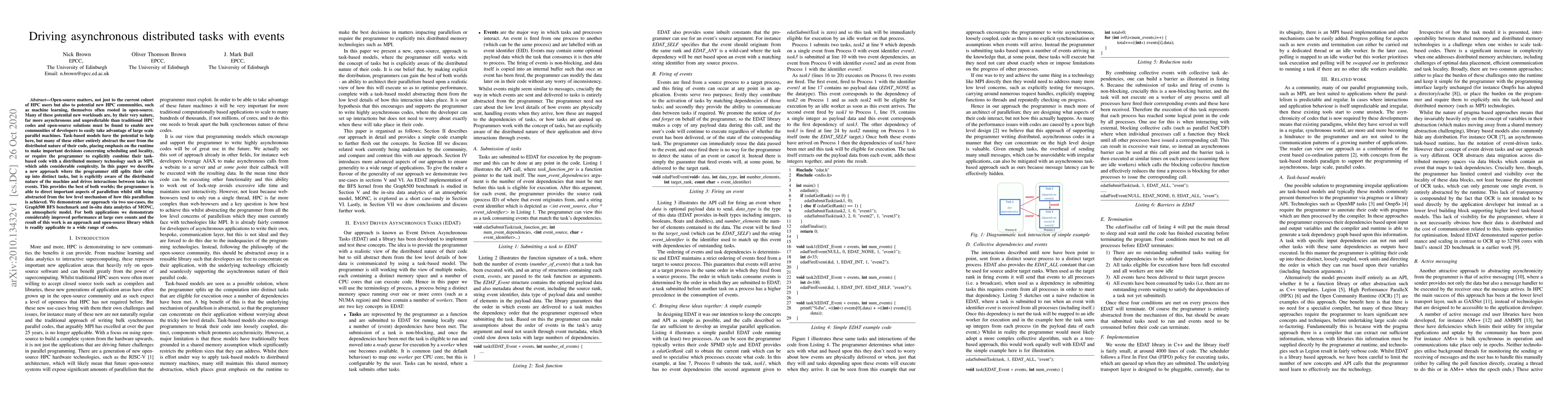 This paper proposes an open-source approach to drive asynchronous distributed tasks using events, aiming to simplify the programming of large-scale parallel machines for new HPC communities like machine learning. The method allows programmers to manage parallelism while abstracting the low-level details, demonstrated through improved performance in the Graph500 BFS benchmark and in-situ data analytics of the MONC atmospheric model.