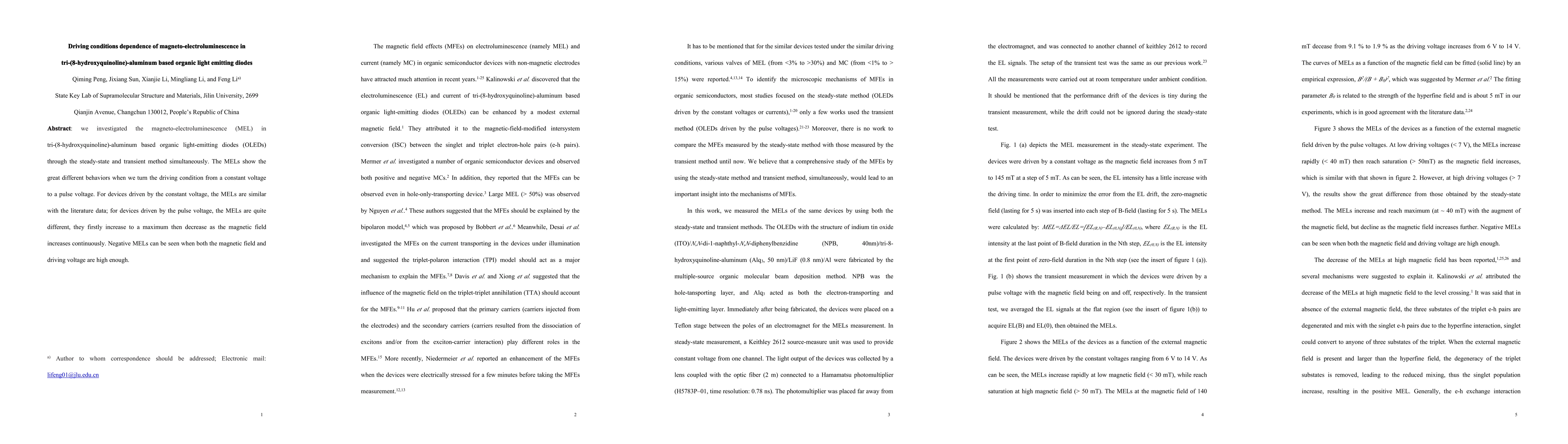 This paper investigates the magneto-electroluminescence (MEL) in tri-(8-hydroxyquinoline)-aluminum based OLEDs under different driving conditions. Under constant voltage, MELs align with literature data, but under pulse voltage, MELs show an initial increase followed by a decrease with rising magnetic field, revealing negative MELs at high magnetic and driving voltages.