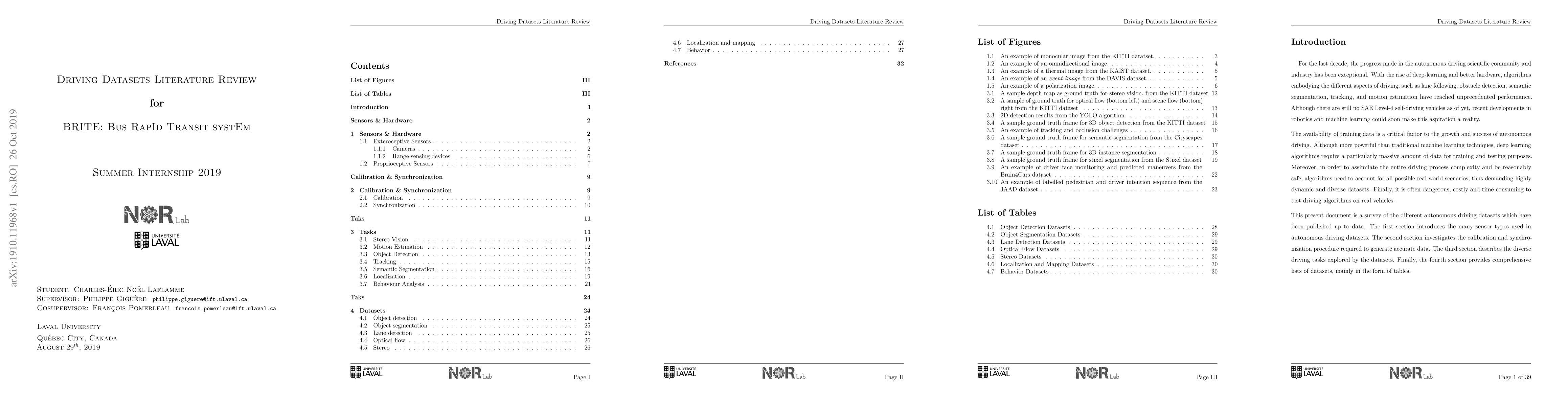 This report is a survey of the different autonomous driving datasets which have been published up to date. The first section introduces the many sensor types used in autonomous driving datasets. The second section investigates the calibration and synchronization procedure required to generate accurate data. The third section describes the diverse driving tasks explored by the datasets. Finally, the fourth section provides comprehensive lists of datasets, mainly in the form of tables.