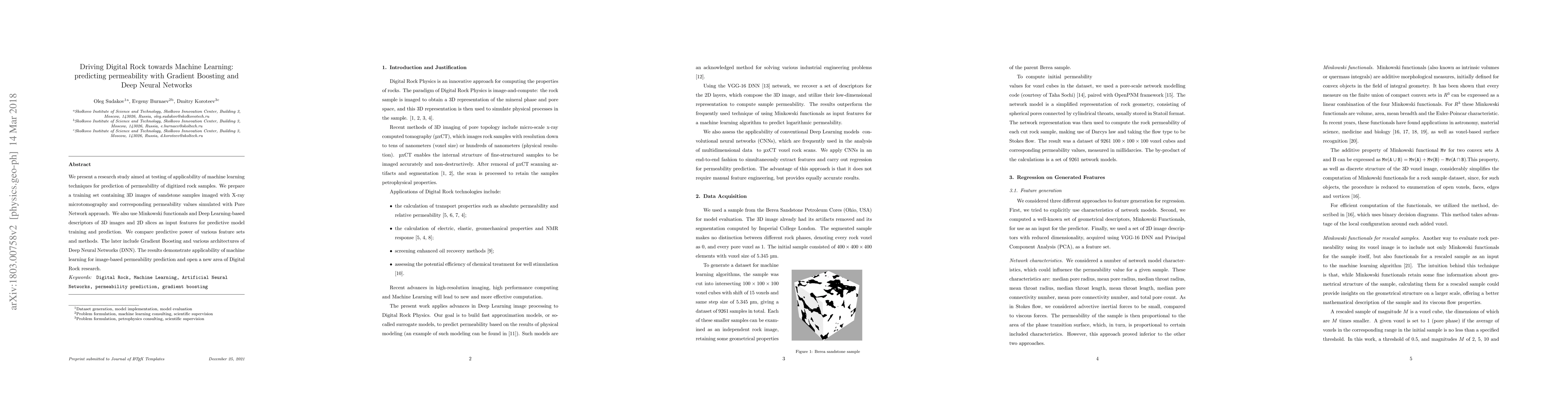 This research explores the use of machine learning techniques, including Gradient Boosting and Deep Neural Networks, to predict the permeability of digitized rock samples. The study employs 3D X-ray microtomography images and corresponding simulated permeability values, comparing different feature sets and methods for optimal predictive performance.