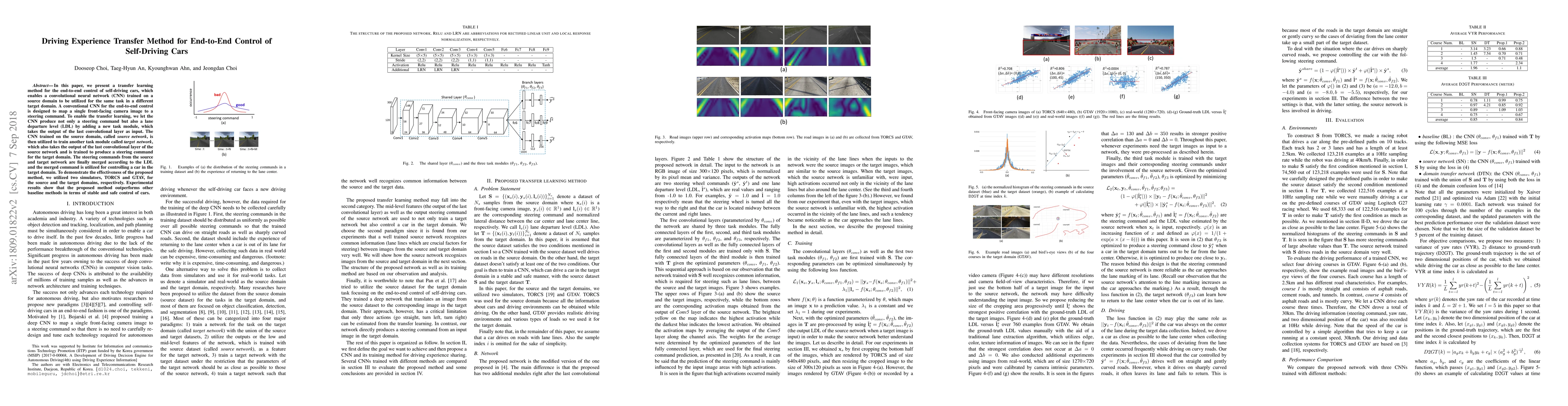 This paper proposes a transfer learning method for end-to-end control of self-driving cars, enabling a CNN trained on one domain to function in another. The method involves training a new task module to produce a lane departure level, merging steering commands from source and target networks, and demonstrating effectiveness in simulators.