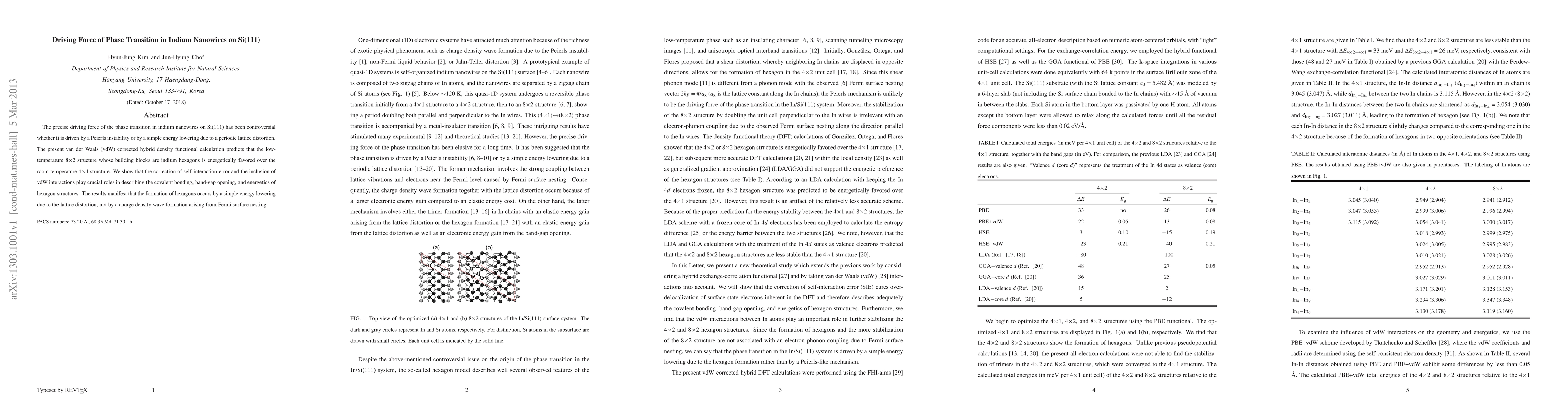 The precise driving force of the phase transition in indium nanowires on Si(111) has been controversial whether it is driven by a Peierls instability or by a simple energy lowering due to a periodic lattice distortion. The present van der Waals (vdW) corrected hybrid density functional calculation predicts that the low-temperature 8x2 structure whose building blocks are indium hexagons is energetically favored over the room-temperature 4x1 structure. We show that the correction of self-interaction error and the inclusion of vdW interactions play crucial roles in describing the covalent bonding, band-gap opening, and energetics of hexagon structures. The results manifest that the formation of hexagons occurs by a simple energy lowering due to the lattice distortion, not by a charge density wave formation arising from Fermi surface nesting.