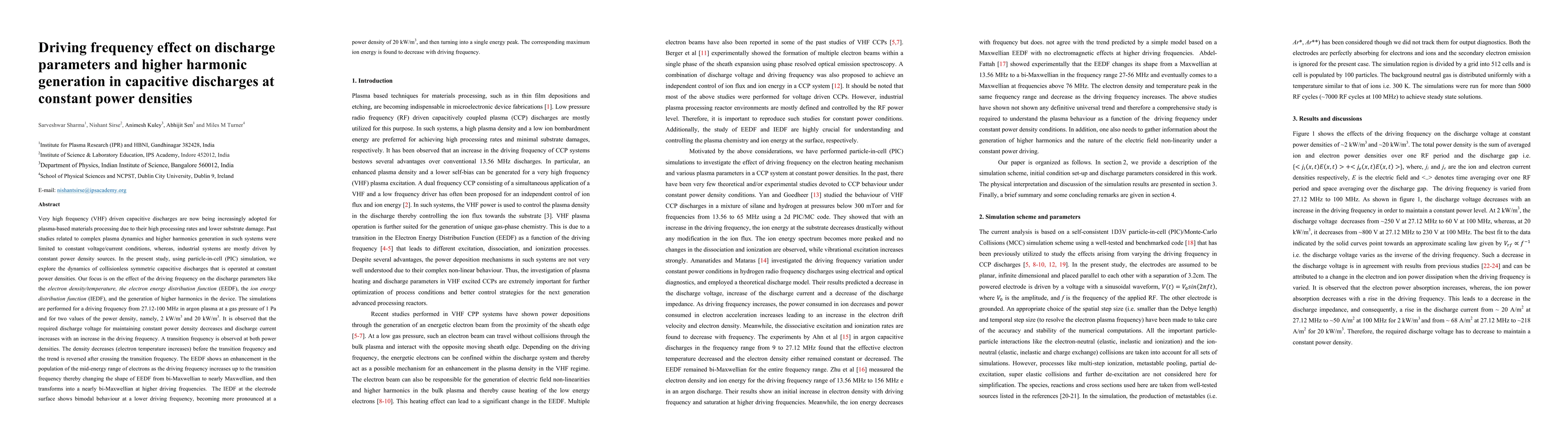 This study investigates the impact of driving frequency on discharge parameters and higher harmonic generation in VHF capacitive discharges operated at constant power densities. Simulation results show that higher frequencies lead to a transition in electron density and temperature, with a shift in the electron energy distribution function and generation of higher harmonics.