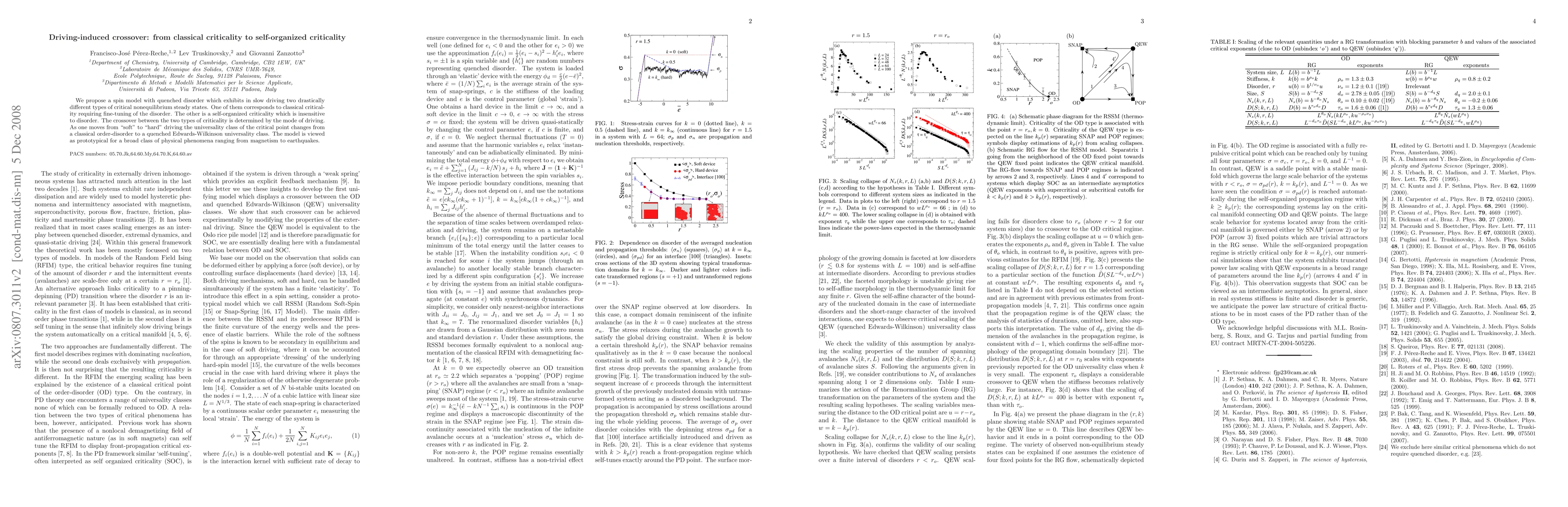 We propose a spin model with quenched disorder which exhibits in slow driving two drastically different types of critical nonequilibrium steady states. One of them corresponds to classical criticality requiring fine-tuning of the disorder. The other is a self-organized criticality which is insensitive to disorder. The crossover between the two types of criticality is determined by the mode of driving. As one moves from "soft" to "hard" driving the universality class of the critical point changes from a classical order-disorder to a quenched Edwards-Wilkinson universality class. The model is viewed as prototypical for a broad class of physical phenomena ranging from magnetism to earthquakes.