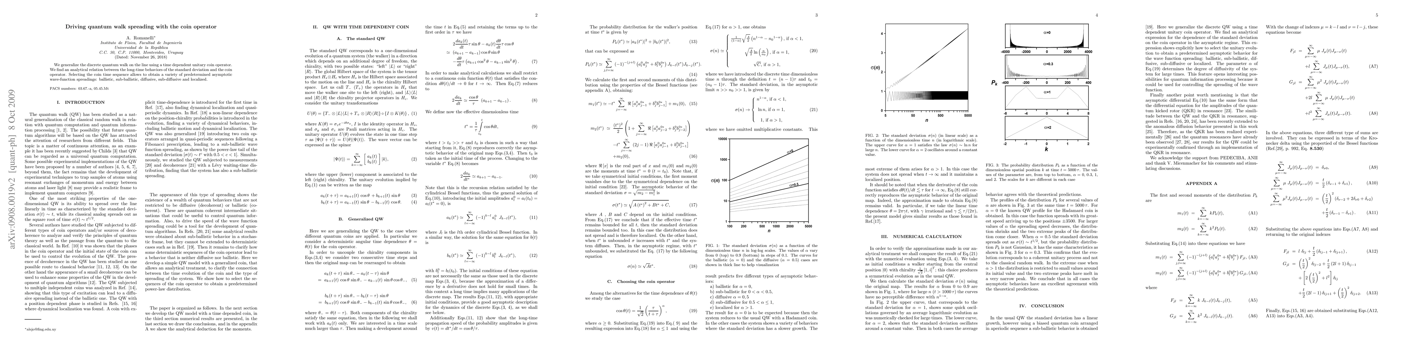 We generalize the discrete quantum walk on the line using a time dependent unitary coin operator. We find an analytical relation between the long-time behaviors of the standard deviation and the coin operator. Selecting the coin time sequence allows to obtain a variety of predetermined asymptotic wave-function spreadings: ballistic, sub-ballistic, diffusive, sub-diffusive and localized.