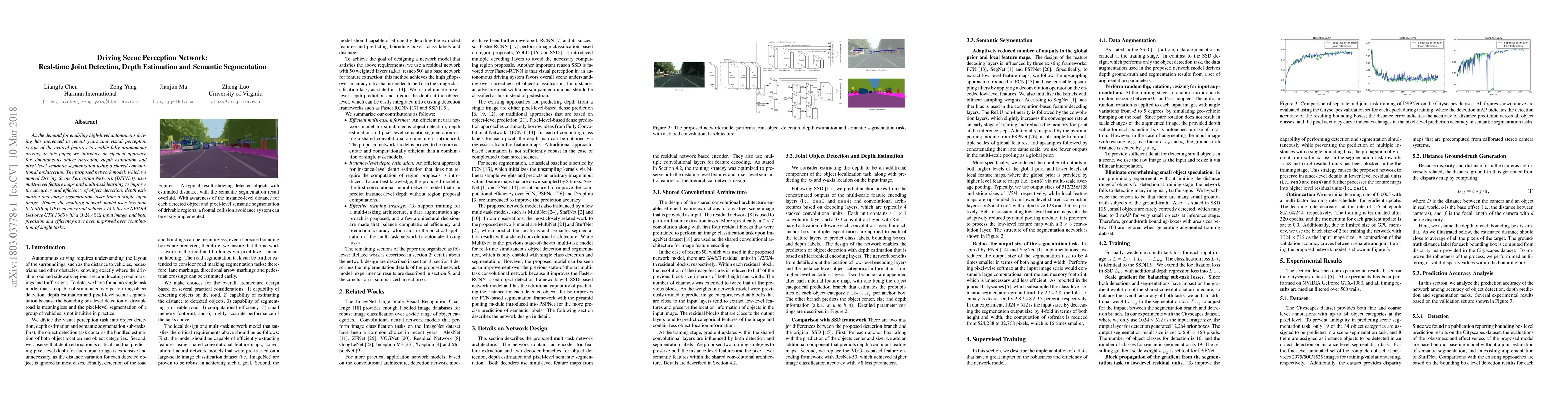The Driving Scene Perception Network (DSPNet) presents an efficient convolutional architecture for real-time joint detection, depth estimation, and semantic segmentation in autonomous driving. The network leverages multi-level feature maps and multi-task learning to enhance accuracy and efficiency, achieving 14.0 fps with less than 850 MiB of GPU memory.