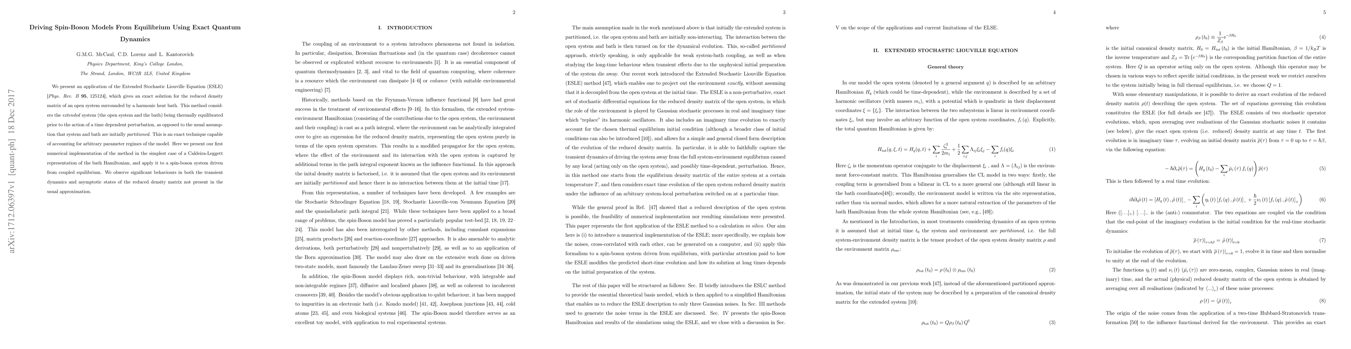 We present an application of the Extended Stochastic Liouville Equation (ESLE) Phys. Rev. B 95, 125124, which gives an exact solution for the reduced density matrix of an open system surrounded by a harmonic heat bath. This method considers the extended system (the open system and the bath) being thermally equilibrated prior to the action of a time dependent perturbation, as opposed to the usual assumption that system and bath are initially partitioned. This is an exact technique capable of accounting for arbitrary parameter regimes of the model. Here we present our first numerical implementation of the method in the simplest case of a Caldeira-Leggett representation of the bath Hamiltonian, and apply it to a spin-Boson system driven from coupled equilibrium. We observe significant behaviours in both the transient dynamics and asymptotic states of the reduced density matrix not present in the usual approximation.
