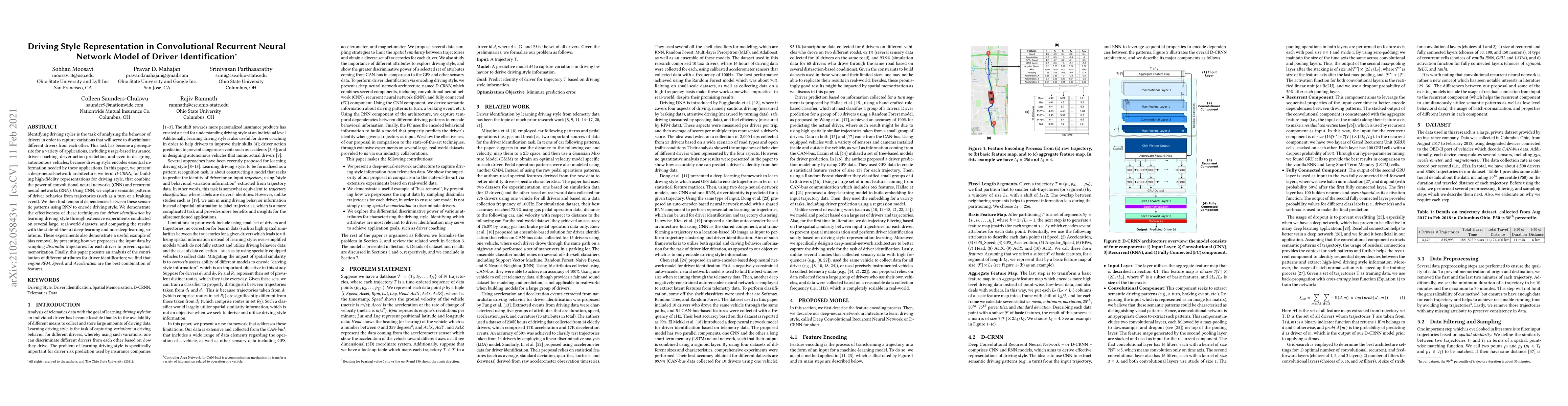 This paper introduces D-CRNN, a deep-neural-network architecture combining CNN and RNN to represent driving styles for driver identification, showing its effectiveness through experiments on real-world datasets and highlighting the importance of engine RPM, Speed, and Acceleration for accurate identification.