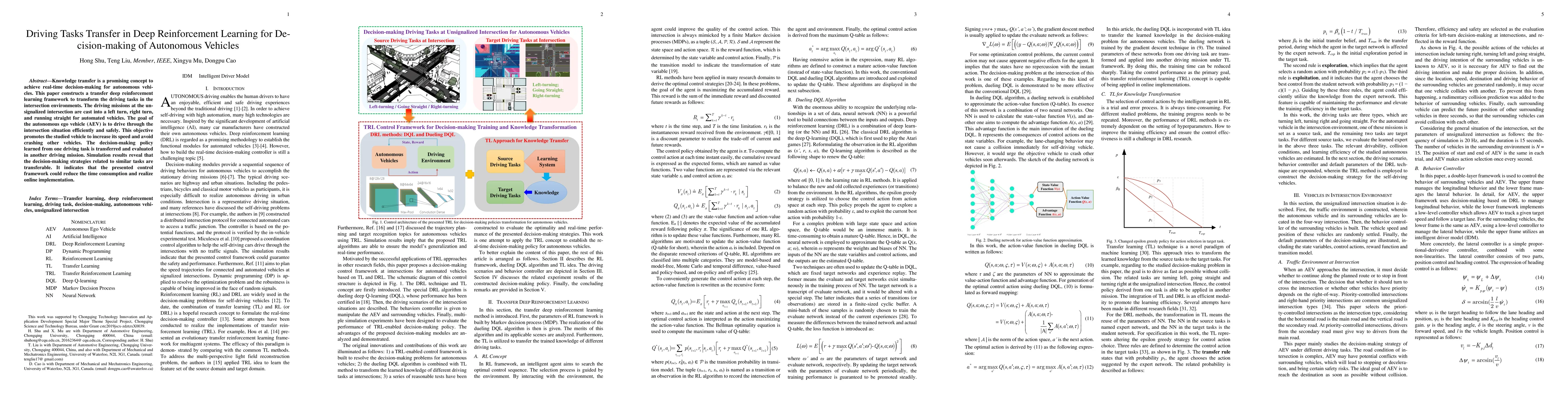 Knowledge transfer is a promising concept to achieve real-time decision-making for autonomous vehicles. This paper constructs a transfer deep reinforcement learning framework to transform the driving tasks in inter-section environments. The driving missions at the un-signalized intersection are cast into a left turn, right turn, and running straight for automated vehicles. The goal of the autonomous ego vehicle (AEV) is to drive through the intersection situation efficiently and safely. This objective promotes the studied vehicle to increase its speed and avoid crashing other vehicles. The decision-making pol-icy learned from one driving task is transferred and evaluated in another driving mission. Simulation results reveal that the decision-making strategies related to similar tasks are transferable. It indicates that the presented control framework could reduce the time consumption and realize online implementation.