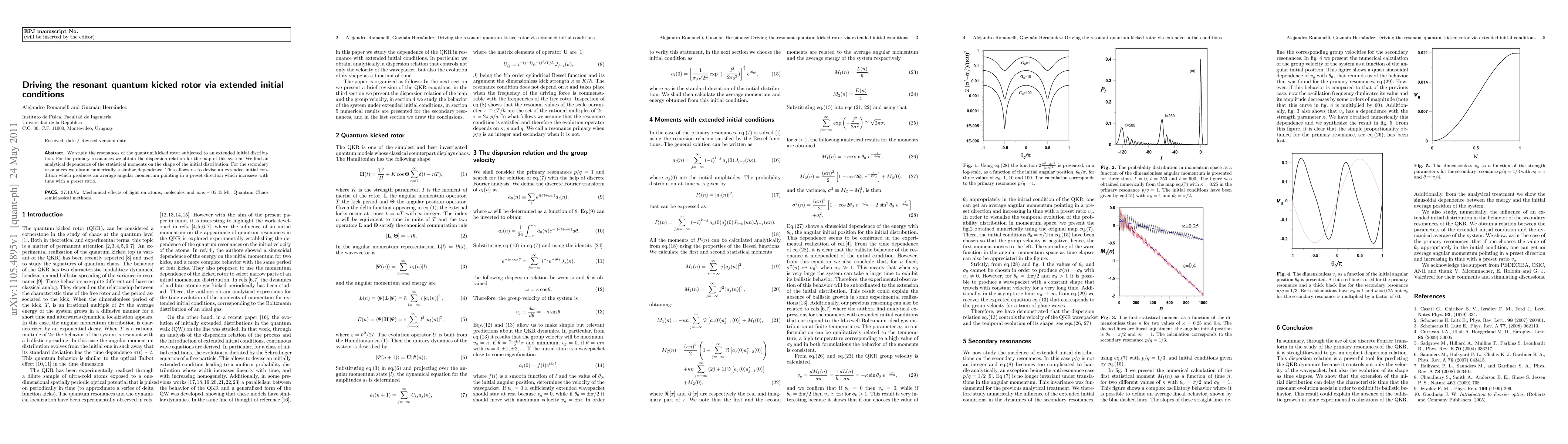 We study the resonances of the quantum kicked rotor subjected to an extended initial distribution. For the primary resonances we obtain the dispersion relation for the map of this system. We find an analytical dependence of the statistical moments on the shape of the initial distribution. For the secondary resonances we obtain numerically a similar dependence. This allows us to devise an extended initial condition which produces an average angular momentum pointing in a preset direction which increases with time with a preset ratio.