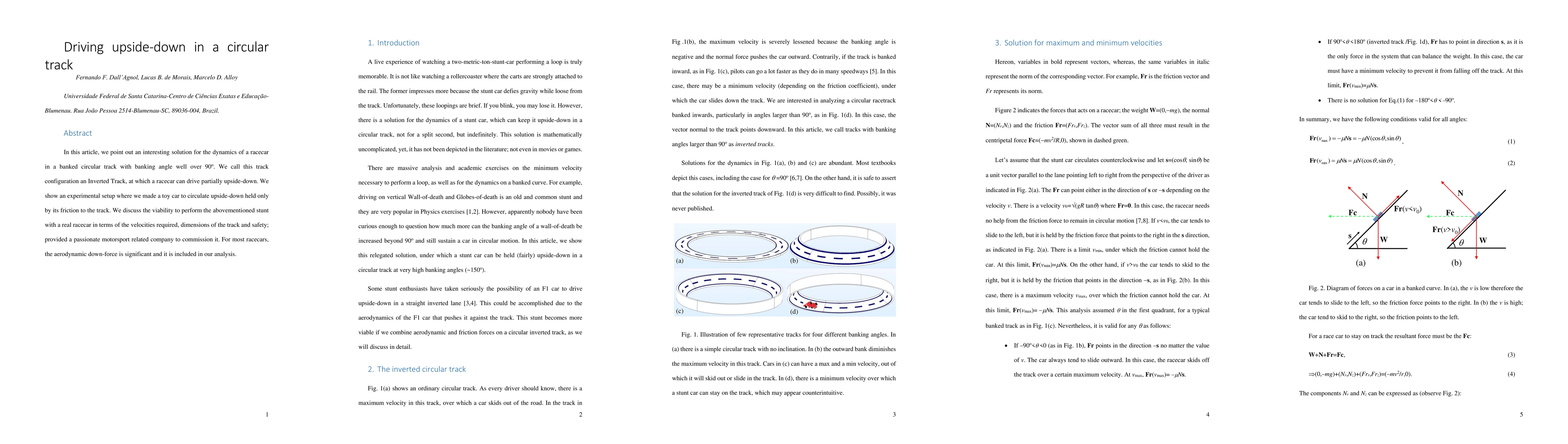 In this article, we point out an interesting solution for the dynamics of a racecar in a banked circular track with banking angle well over 90o. We call this track configuration an Inverted Track, at which a racecar can drive partially upside-down. We show an experimental setup where we made a toy car to circulate upside-down held only by its friction to the track. We discuss the viability to perform the abovementioned stunt with a real racecar in terms of the velocities required, dimensions of the track and safety; provided a passionate motorsport related company to commission it. For most racecars, the aerodynamic down-force is significant and it is included in our analysis.