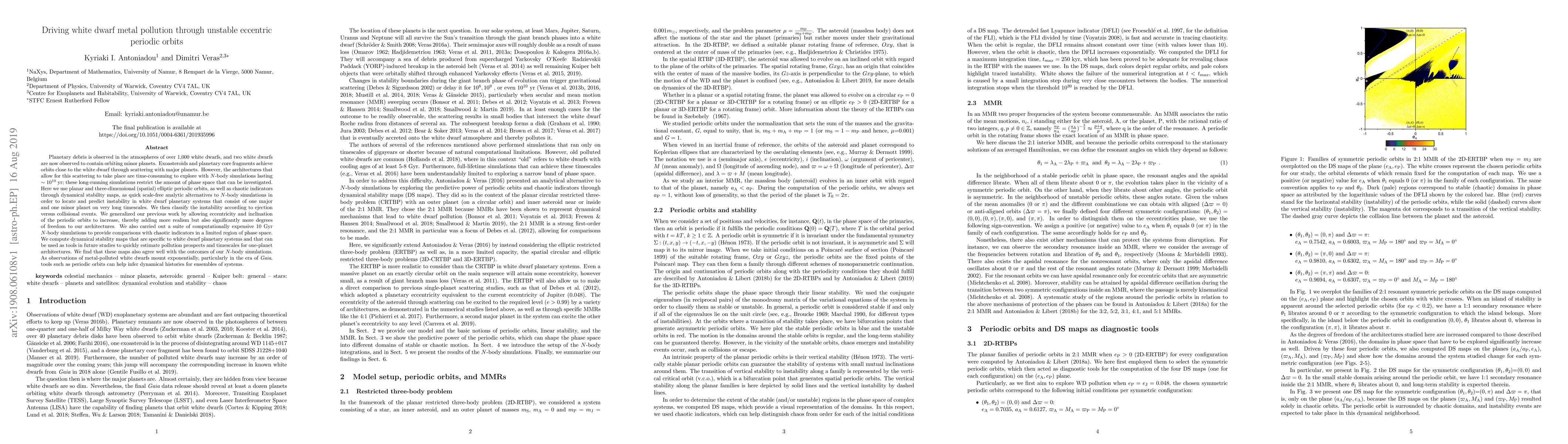 Planetary debris is observed in the atmospheres of over 1,000 white dwarfs, and two white dwarfs are now observed to contain orbiting minor planets. Exoasteroids and planetary core fragments achieve orbits close to the white dwarf through scattering with major planets. However, the architectures that allow for this scattering to take place are time-consuming to explore with $N$-body simulations lasting $\sim 10^{10}$ yr; these long-running simulations restrict the amount of phase space that can be investigated. Here we use planar and three-dimensional (spatial) elliptic periodic orbits, as well as chaotic indicators through dynamical stability maps, as quick scale-free analytic alternatives to $N$-body simulations in order to locate and predict instability in white dwarf planetary systems that consist of one major and one minor planet on very long timescales. We then classify the instability according to ejection versus collisional events. We generalized our previous work by allowing eccentricity and inclination of the periodic orbits to increase, thereby adding more realism but also significantly more degrees of freedom to our architectures. We also carried out a suite of computationally expensive 10 Gyr $N$-body simulations to provide comparisons with chaotic indicators in a limited region of phase space. We compute dynamical stability maps that are specific to white dwarf planetary systems and that can be used as tools in future studies to quickly estimate pollution prospects and timescales for one-planet architectures. We find that these maps also agree well with the outcomes of our $N$-body simulations. As observations of metal-polluted white dwarfs mount exponentially, particularly in the era of Gaia, tools such as periodic orbits can help infer dynamical histories for ensembles of systems.