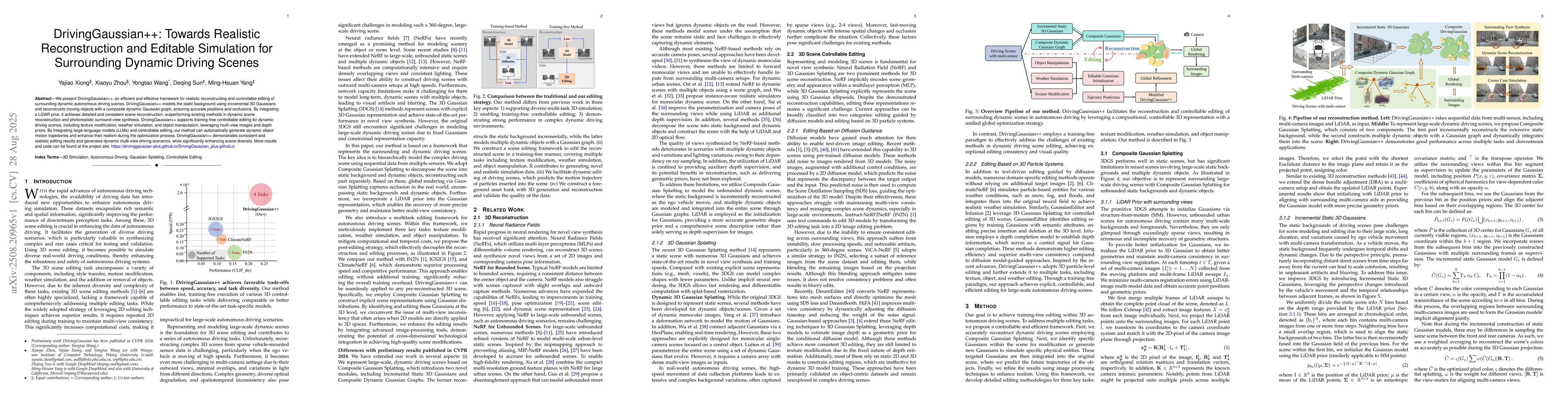We present DrivingGaussian++, an efficient and effective framework for realistic reconstructing and controllable editing of surrounding dynamic autonomous driving scenes. DrivingGaussian++ models the static background using incremental 3D Gaussians and reconstructs moving objects with a composite dynamic Gaussian graph, ensuring accurate positions and occlusions. By integrating a LiDAR prior, it achieves detailed and consistent scene reconstruction, outperforming existing methods in dynamic scene reconstruction and photorealistic surround-view synthesis. DrivingGaussian++ supports training-free controllable editing for dynamic driving scenes, including texture modification, weather simulation, and object manipulation, leveraging multi-view images and depth priors. By integrating large language models (LLMs) and controllable editing, our method can automatically generate dynamic object motion trajectories and enhance their realism during the optimization process. DrivingGaussian++ demonstrates consistent and realistic editing results and generates dynamic multi-view driving scenarios, while significantly enhancing scene diversity. More results and code can be found at the project site: https://xiong-creator.github.io/DrivingGaussian_plus.github.io