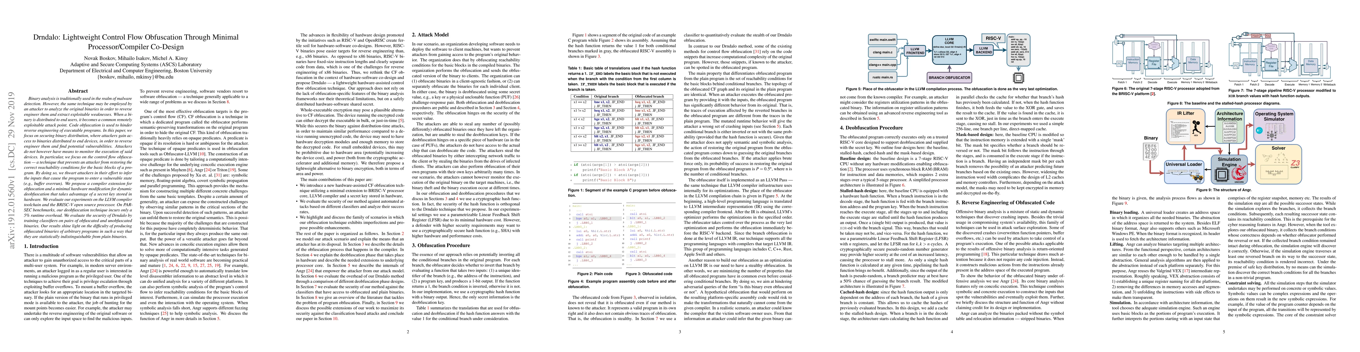 This paper proposes Drndalo, a lightweight control flow obfuscation technique through minimal processor/compiler co-design, aimed at securing binaries against reverse engineering. It employs a compiler extension and minimal hardware modification for dynamic deobfuscation, achieving only a 5% runtime overhead on PARSEC benchmarks.