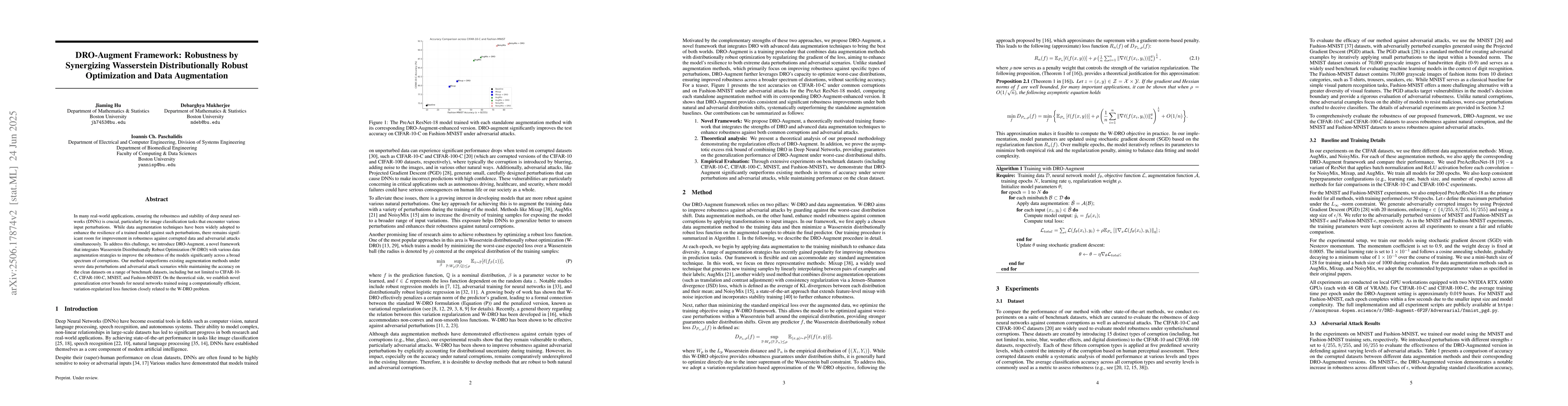 In many real-world applications, ensuring the robustness and stability of deep neural networks (DNNs) is crucial, particularly for image classification tasks that encounter various input perturbations. While data augmentation techniques have been widely adopted to enhance the resilience of a trained model against such perturbations, there remains significant room for improvement in robustness against corrupted data and adversarial attacks simultaneously. To address this challenge, we introduce DRO-Augment, a novel framework that integrates Wasserstein Distributionally Robust Optimization (W-DRO) with various data augmentation strategies to improve the robustness of the models significantly across a broad spectrum of corruptions. Our method outperforms existing augmentation methods under severe data perturbations and adversarial attack scenarios while maintaining the accuracy on the clean datasets on a range of benchmark datasets, including but not limited to CIFAR-10-C, CIFAR-100-C, MNIST, and Fashion-MNIST. On the theoretical side, we establish novel generalization error bounds for neural networks trained using a computationally efficient, variation-regularized loss function closely related to the W-DRO problem.
