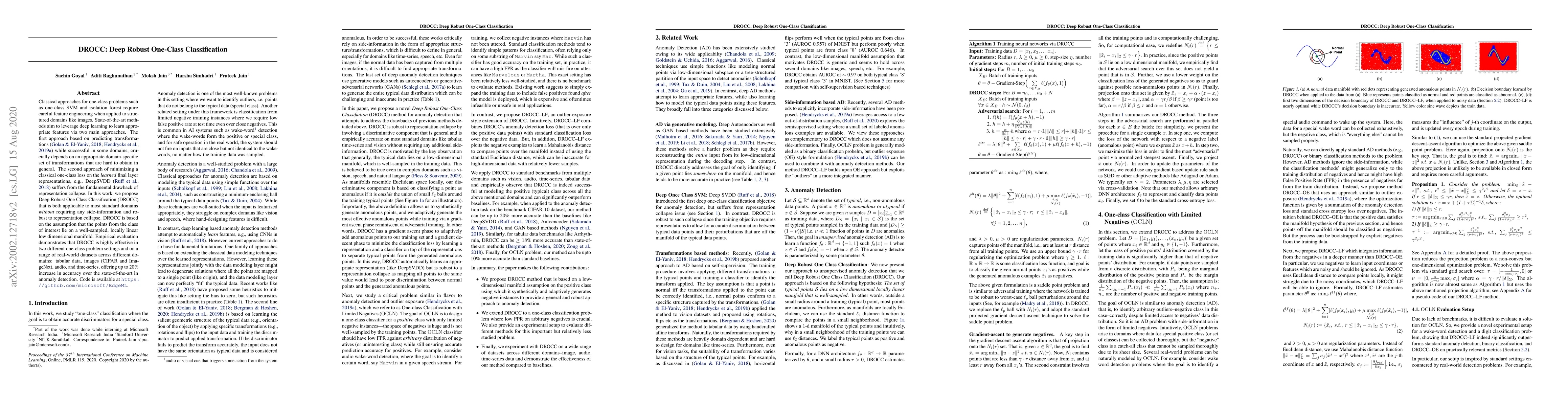 Classical approaches for one-class problems such as one-class SVM and isolation forest require careful feature engineering when applied to structured domains like images. State-of-the-art methods aim to leverage deep learning to learn appropriate features via two main approaches. The first approach based on predicting transformations (Golan & El-Yaniv, 2018; Hendrycks et al., 2019a) while successful in some domains, crucially depends on an appropriate domain-specific set of transformations that are hard to obtain in general. The second approach of minimizing a classical one-class loss on the learned final layer representations, e.g., DeepSVDD (Ruff et al., 2018) suffers from the fundamental drawback of representation collapse. In this work, we propose Deep Robust One-Class Classification (DROCC) that is both applicable to most standard domains without requiring any side-information and robust to representation collapse. DROCC is based on the assumption that the points from the class of interest lie on a well-sampled, locally linear low dimensional manifold. Empirical evaluation demonstrates that DROCC is highly effective in two different one-class problem settings and on a range of real-world datasets across different domains: tabular data, images (CIFAR and ImageNet), audio, and time-series, offering up to 20% increase in accuracy over the state-of-the-art in anomaly detection. Code is available at https://github.com/microsoft/EdgeML.