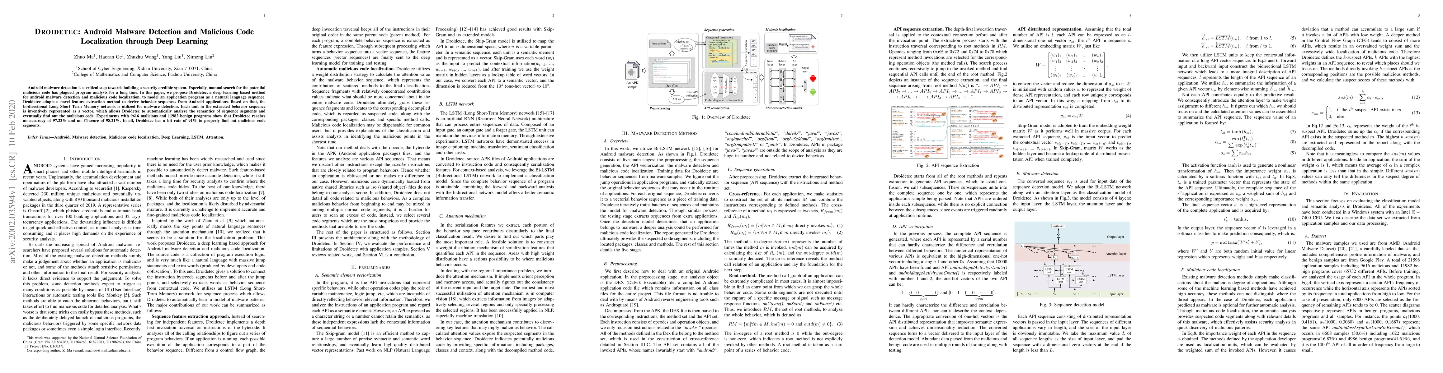 Droidetec employs deep learning to detect Android malware and localize malicious code by modeling applications as natural language sequences, achieving 97.22% accuracy and 98.21% F1-score in experiments, with a 91% success rate for identifying malicious segments.